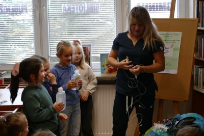 Wizyta Pani Kariny podzielona było na dwie części. W pierwszej nasz gość opowiadał dzieciom o pracy, którą wykonuje na co dzień oraz o tym, skąd czerpie pomysły na wiersze. Autorka czytała wiersze i pokazała ilustracje zamieszczone w książce. W drugiej części dzieci miały okazję samodzielnie zobaczyć na czym polega praca w szpitalu: bandażowały rany, mierzyły ciśnienie, słuchały bicia serca, dowiedziały się jak zakłada się kroplówkę i mogły z bliska obejrzeć przyrządy używane w pracy w szpitalu.