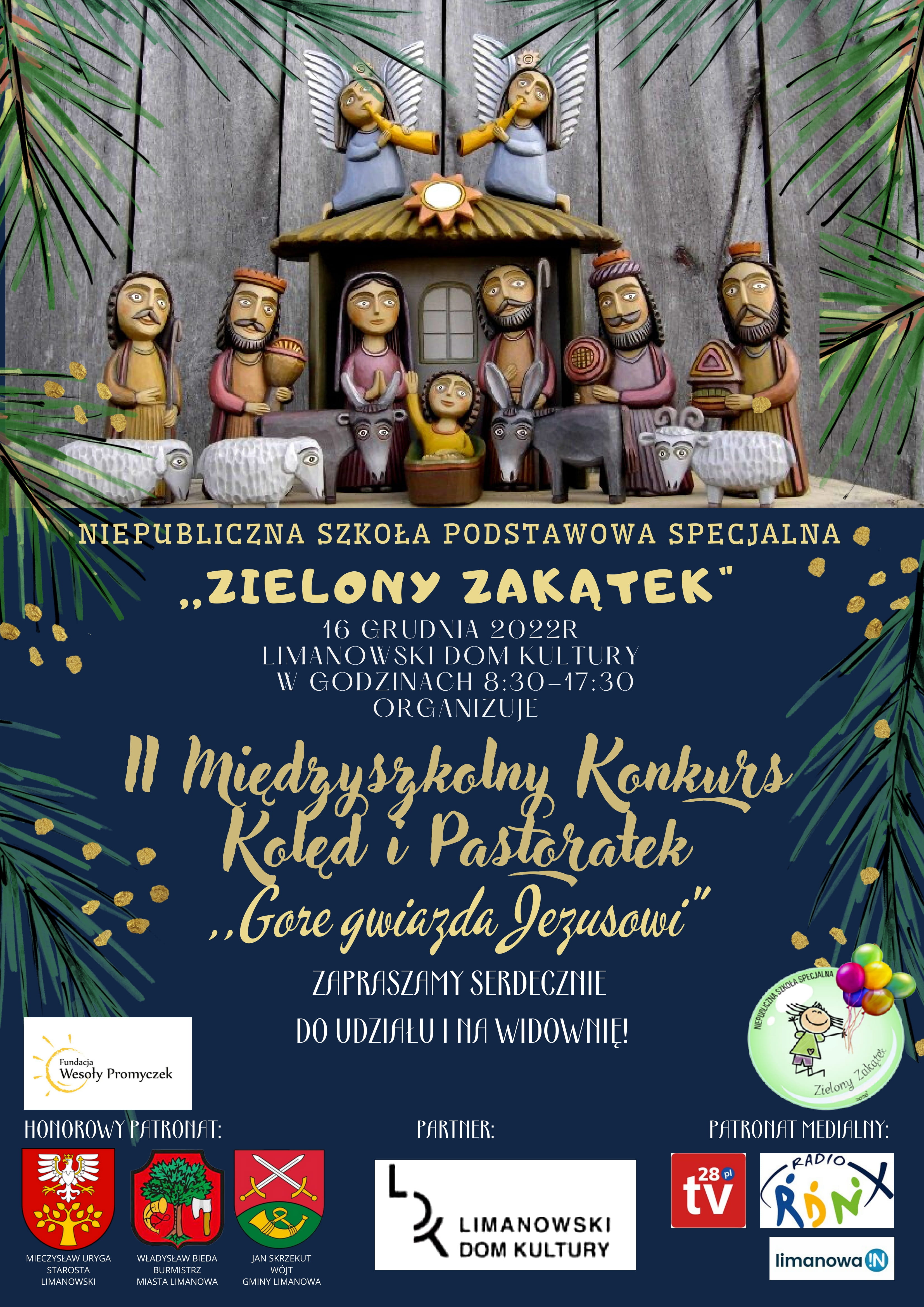 NIEPUBLICZNA SZKOŁA PODSTAWOWA SPECJALNA „ZIELONY ZAKĄTEK” organizuje II Międzyszkolny Konkurs Kolęd i Pastorałek pod hasłem: "GORE GWIAZDA JEZUSOWI", który odbędzie się 16 grudnia 2022 roku w Limanowskim Domu Kultury w godzinach od 8.30 do 17.30.