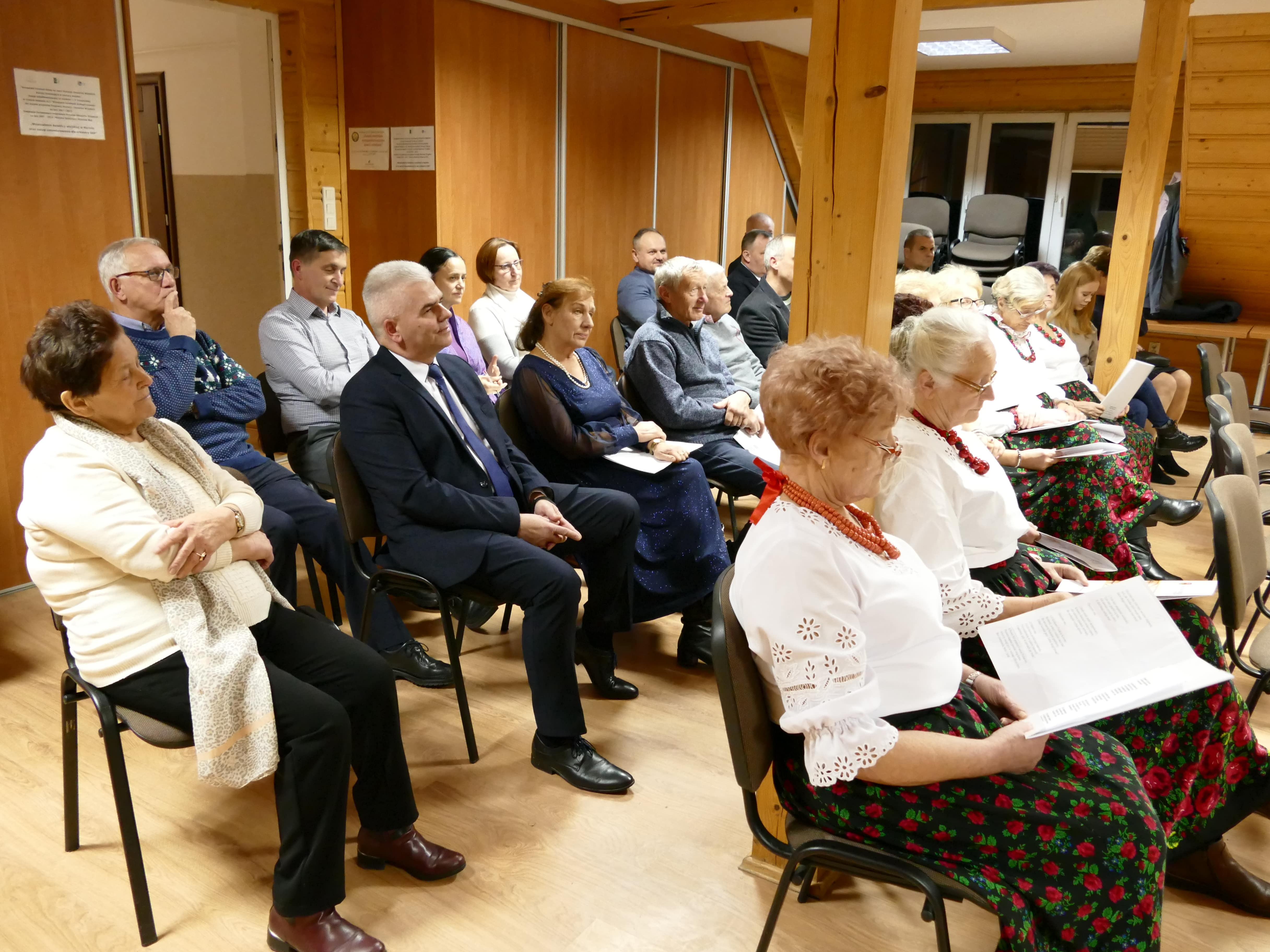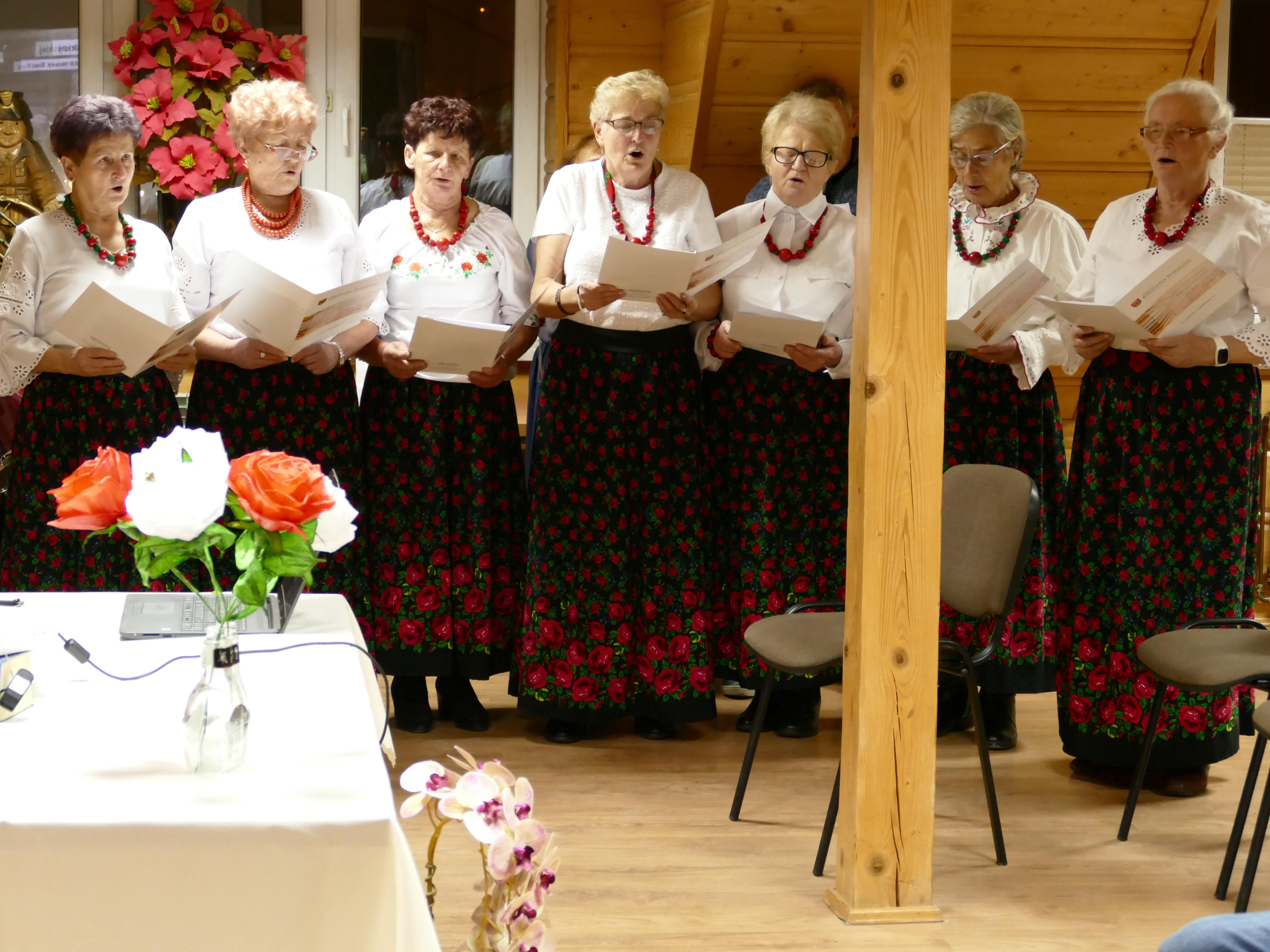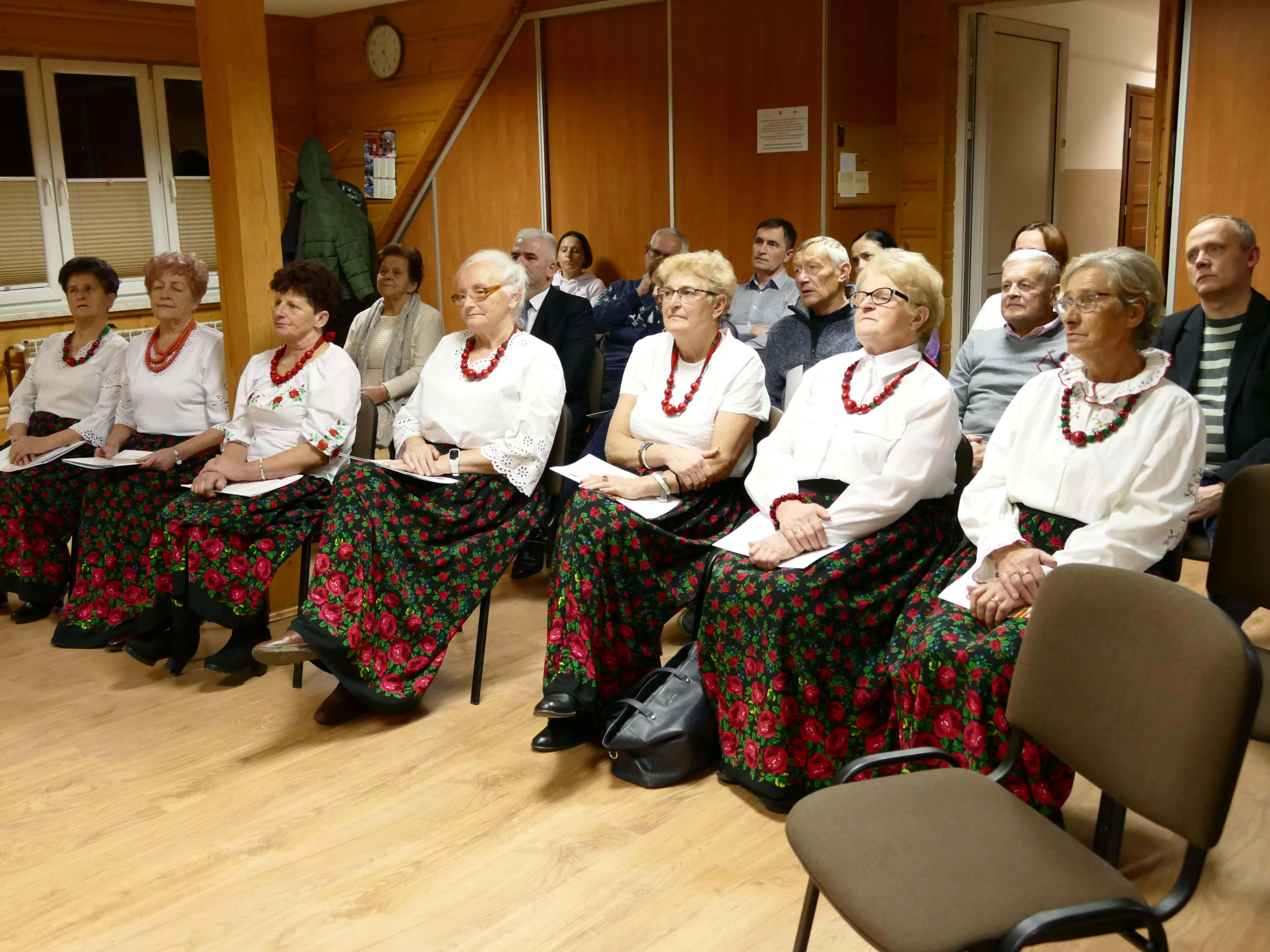 Preludium do wykładu był występ pań z Klubu Seniora w Męcinie, które krótkim koncertem znanych pieśni patriotycznych wspaniale wprowadziły zebranych w atmosferę spotkania. Panie zachwyciły nie tylko kunsztem wykonania, ale i regionalnymi strojami. Lekkie nutki wykonu pieśni partyzanckich włączyły publiczność do wspólnego śpiewu.