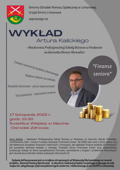 Urząd Gminy Limanowa i Gminny Ośrodek Pomocy Społecznej w Limanowej zapraszają na wykład Artura Kalickiego - Absolwenta Profesjonalnej Szkoły Biznesu w Krakowie na kierunku Biznes Menadżer.