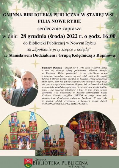Gminna Biblioteka Publiczna w Starej Wsi Filia Nowe Rybie serdecznie zaprasza w dniu 28 grudnia (środa) 2022 r. o godz. 1600 do Biblioteki Publicznej w Nowym Rybiu na „Spotkanie przy szopce z kolędą” ze Stanisławem Dudziakiem i Grupą Kolędniczą z Rupniowa.