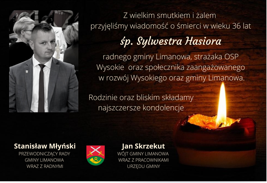 Z wielkim smutkiem i żalem przyjęliśmy wiadomość o śmierci w wieku 36 lat śp. Sylwestra Hasiora radnego gminy Limanowa, strażaka OSP Wysokie  oraz społecznika zaangażowanego w rozwój Wysokiego oraz gminy Limanowa.