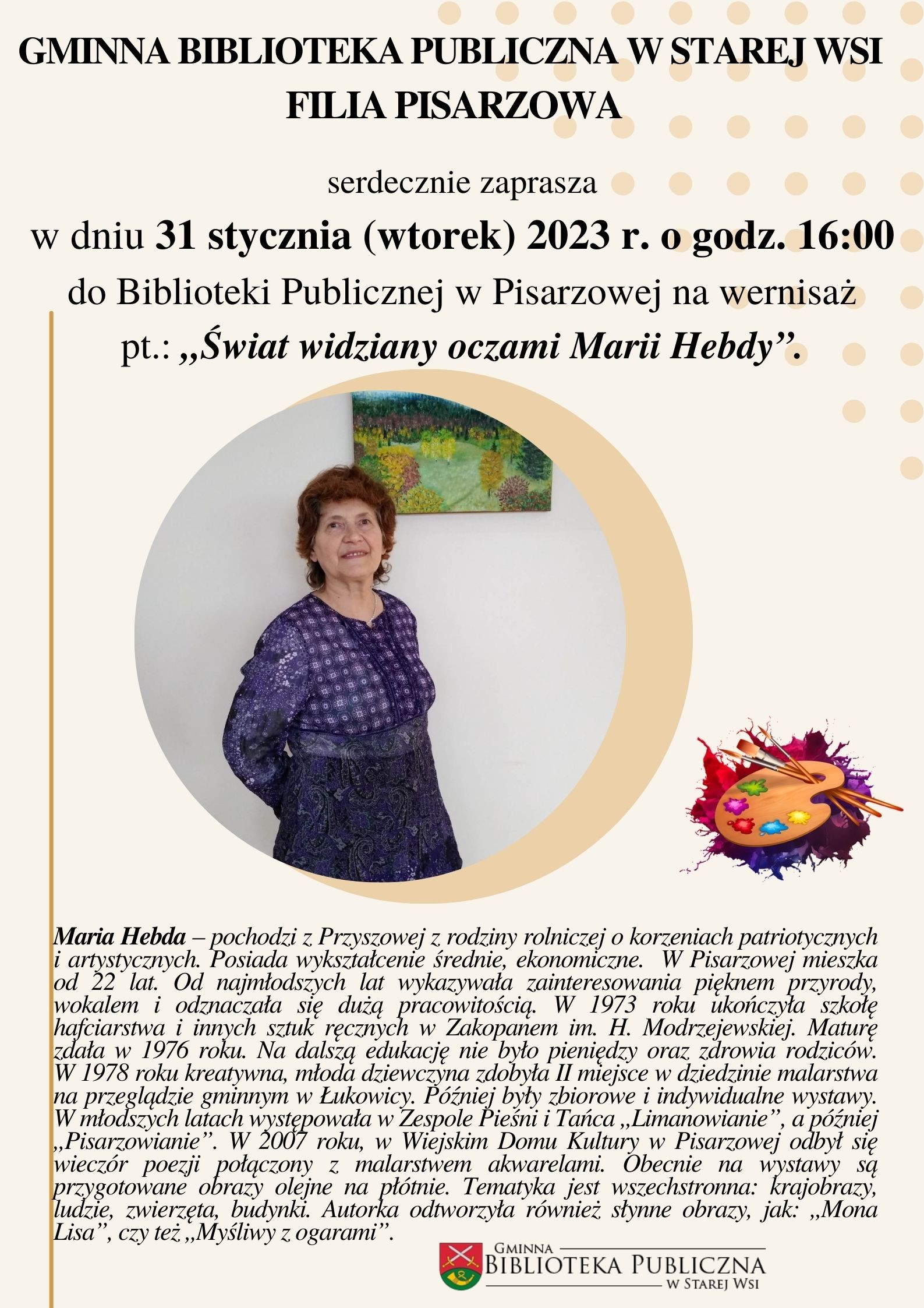 Maria Hebda – pochodzi z Przyszowej z rodziny rolniczej o korzeniach patriotycznych i artystycznych. Posiada wykształcenie średnie, ekonomiczne. W Pisarzowej mieszka od 22 lat. Od najmłodszych lat wykazywała zainteresowania pięknem przyrody, wokalem i odznaczała się dużą pracowitością. W 1973 roku ukończyła szkołę hafciarstwa i innych sztuk ręcznych w Zakopanem im. H. Modrzejewskiej. Maturę zdała w 1976 roku. Na dalszą edukację nie było pieniędzy oraz zdrowia rodziców. W 1978 roku kreatywna, młoda dziewczyna zdobyła II miejsce w dziedzinie malarstwa na przeglądzie gminnym w Łukowicy. Później były zbiorowe i indywidualne wystawy. W młodszych latach występowała w Zespole Pieśni i Tańca ,,Limanowianie”, a później ,,Pisarzowianie”. W 2007 roku, w Wiejskim Domu Kultury w Pisarzowej odbył się wieczór poezji połączony z malarstwem akwarelami. Obecnie na wystawy są przygotowane obrazy olejne na płótnie. Tematyka jest wszechstronna: krajobrazy, ludzie, zwierzęta, budynki. Autorka odtworzyła również słynne obrazy, jak: ,,Mona Lisa”, czy też ,,Myśliwy z ogarami”.