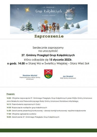 15 stycznia 2023 w świetlicy w Starej Wsi odbędzie się 27. Przegląd Grup Kolędniczych z terenu Gminy Limanowa.