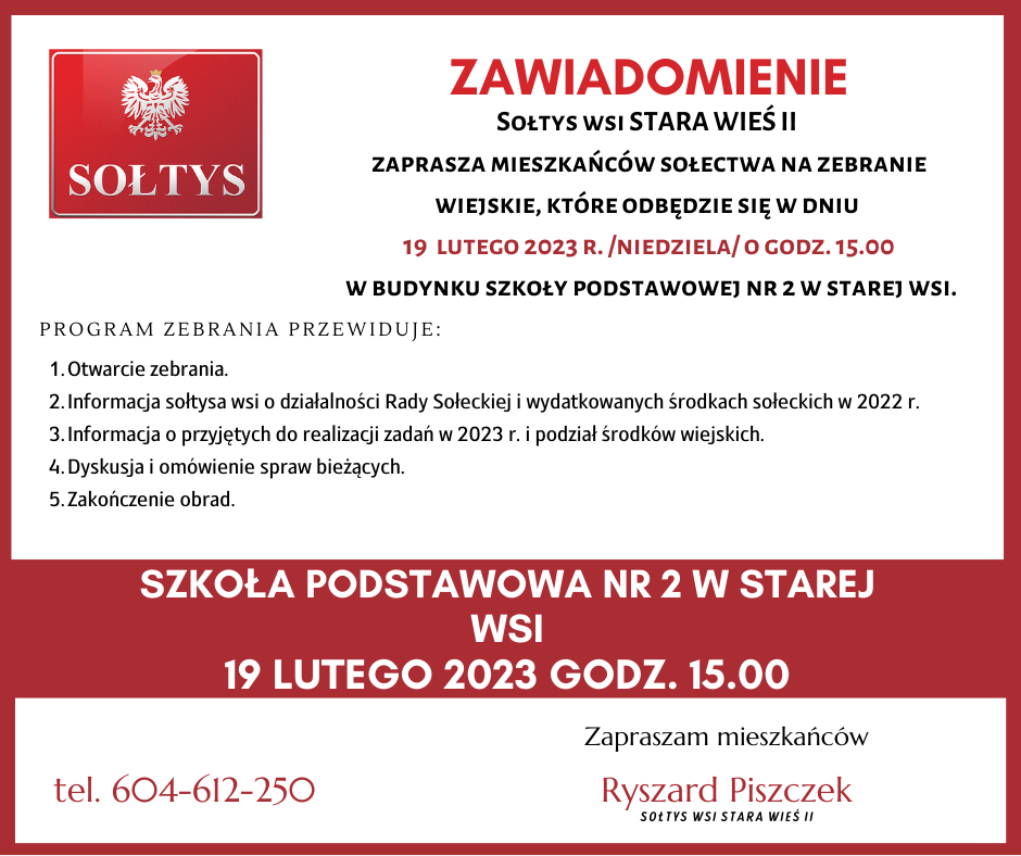 Sołtys wsi Stara Wieś II zaprasza mieszkańców sołectwana zebranie wiejskie, które odbędzie się w dniu 19 lutego 2023 r. /niedziela/ o godz. 1500 w budynku Szkoły Podstawowej nr 2 w Starej Wsi.