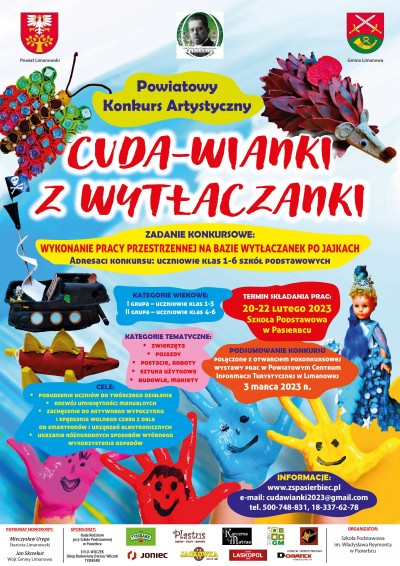 Wimieniu Organizatorów serdecznie zapraszamy do wzięcia udziału w Powiatowym Konkursie Artystycznym CUDA-WIANKI Z WYTŁACZANKI organizowanym przez Szkołę Podstawową im. Władysława Reymonta w Pasierbcu pod honorowym patronatem STAROSTY LIMANOWSKIEGO Mieczysława Urygi oraz WÓJTA GMINY LIMANOWA - Jana Skrzekuta.