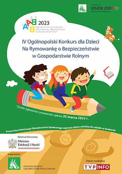 Kasa Rolniczego Ubezpieczenia Społecznego serdecznie zaprasza dzieci rolników do udziału w Ogólnopolskim Konkursie dla Dzieci na Rymowankę o Bezpieczeństwie w Gospodarstwie Rolnym „Bezpiecznie na wsi mamy, niebezpiecznych substancji unikamy” pod Patronatem Honorowym Ministra Edukacji i Nauki.