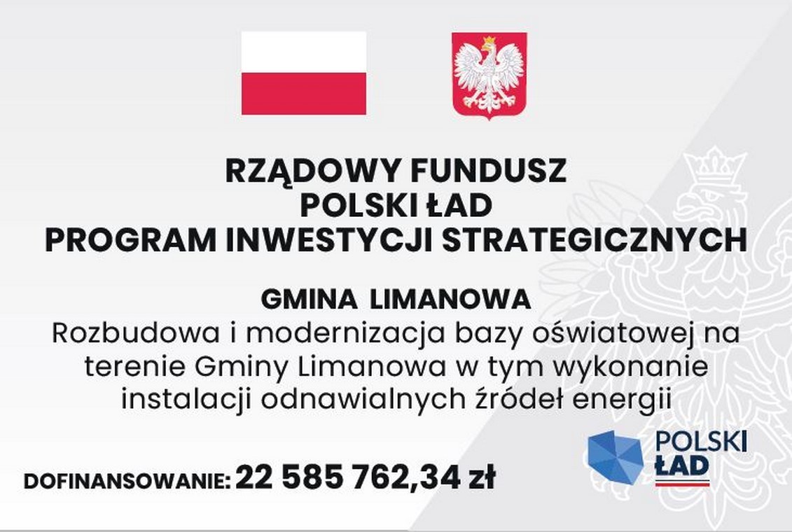 26 571 485,11 zł z czego aż 85% tj. 22 585 762,34 zł stanowi dotacja z Rządowego Funduszu Inwestycji Strategicznych – POLSKI ŁAD. Pozostałą kwotę 3 985 722,77 zł stanowi wkład własny Gminy Limanowa.
