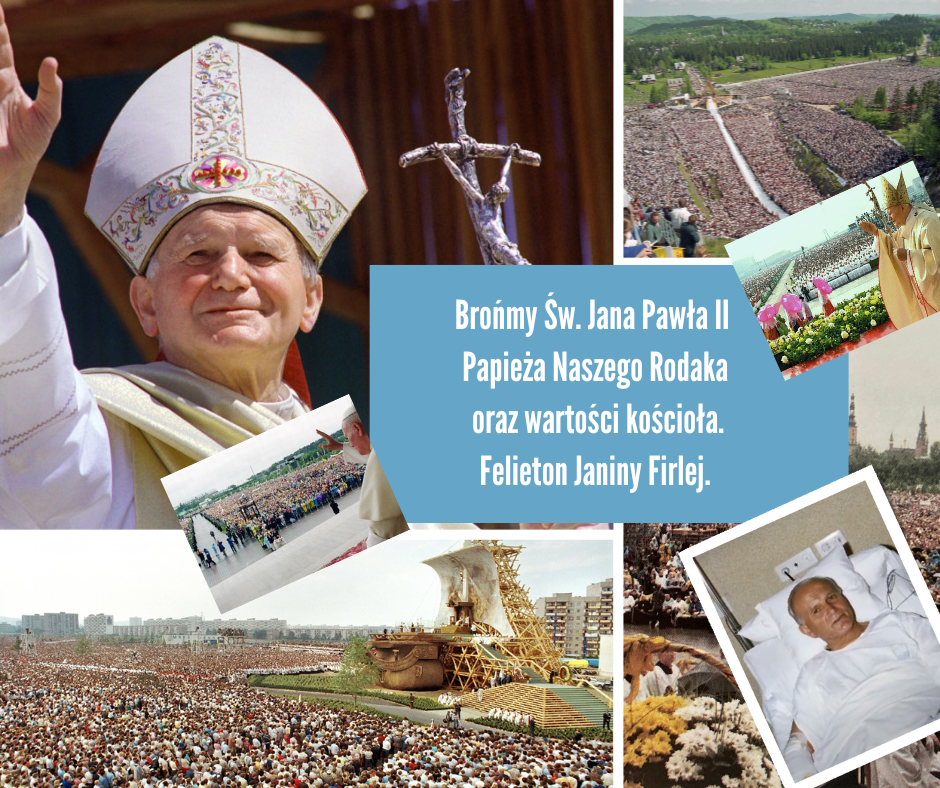 Krzywda wyrządzona Ojcu Św. Janowi Pawłowi II będzie początkiem naszego pozytywnego otwarcia na spuściznę i dziedzictwo, jakie Polski Papież pozostawił swoim rodakom. To bardzo przykre, że w naszej Ojczyźnie są ludzie, którzy w bezwzględny okrutny, hańbiący sposób niszczą nasze autorytety poniżają , szlachetność, godność Papieża Św. Jana Pawła II ,tym samym poniżając godność chrześcijan na całym świecie.Niech nasza postawa będzie świadectwem dla wszystkich , którzy próbują odebrać nam Polakom godność i wymazać z pamięci Św. Jana Pawła II. Kościół to ludzie wiary, toteż są prześladowani fizycznie, ośmieszani. Są pod ciągłym szyderstwem i kłamstwem zadawanym chrześcijaństwu. Aktualna atmosfera w Ojczyźnie Jana Pawła II przypomina zamach 13 maja l98l roku, który był próbą zamknięcia ust ,które głosiły prawdę o Chrystusie.