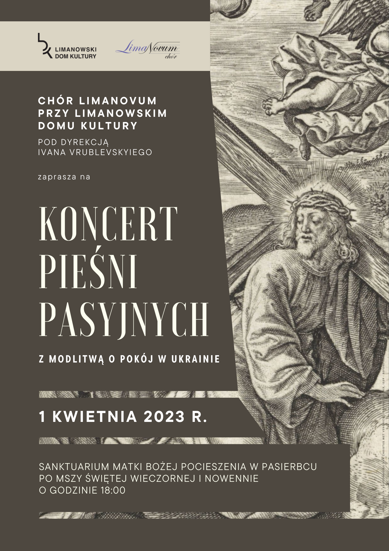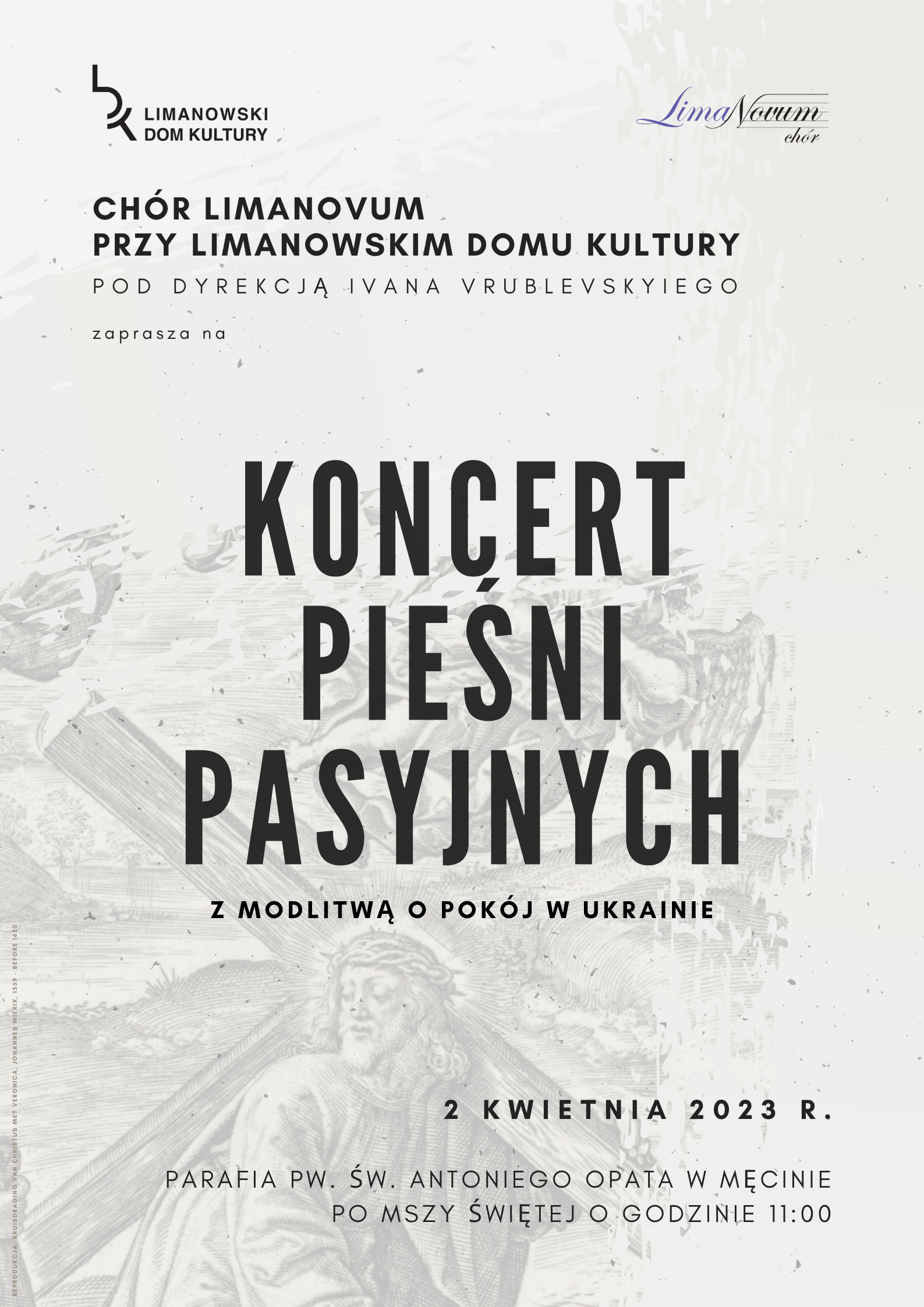 Chór LimaNovum działający przy Limanowskim Domu Kultury wystąpi z koncertem pieśni pasyjnych w Sanktuarium Matki Bożej Pocieszenia w Pasierbcu i w kościele pw. św Antoniego Opata w Męcinie. Zespół przygotował ciekawy repertuar, który po raz pierwszy zaprezentuje w Pasierbcu 1 kwietnia br. po wieczornych nabożeństwach, a po raz drugi w kościele parafialnym w Męcinie po uroczystej sumie Niedzieli Palmowej. W programie koncertu znajdą się  utwory : Bartosza Kowalskiego, Mariana Sawy, Ivana. Vrublevskyiego, Artema Wedela, Marii Slepchenko. Tematyka utworów nawiązuje do wydarzeń w Ogrójcu aż po ukrzyżowanie.
