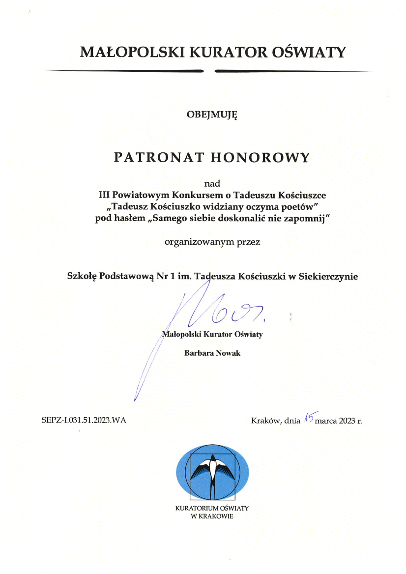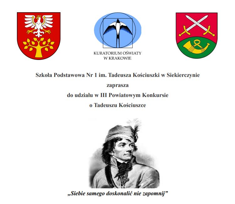 Zachęcamy  do udziału w III Powiatowym Konkursie  o Tadeuszu Kościuszce  , którego mottem przewodnim jest „Siebie samego doskonalić nie zapomnij”. Patronat honorowy wydarzenia obejmują : Kuratorium Oświaty w Krakowie, Starosta Powiatu Limanowskiego Mieczysław Uryga oraz Wójt Gminy Limanowa Jan Skrzekut. Konkurs będzie miał miejsce 25 kwietnia 2023 r. w Szkole Podstawowej Nr 1 im. Tadeusza Kościuszki w Siekierczynie. Przesłuchania rozpoczną się o godzinie 10:00. O ewentualnej zmianie terminu lub godziny przesłuchań organizator poinformuje uczestników , oraz osoby które zechcą wziąć udział w tym wydarzeniu na na stronie szkoły .