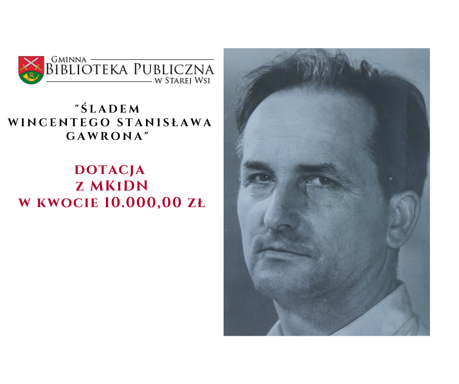 Z radością informujemy naszych Czytelników, że nasz drugi wniosek zgłoszony do programu Promocja czytelnictwa ,,Śladem Wincentego Stanisława Gawrona" uzyskał dotację MKiDN w kwocie 10000,00 zł. Biblioteka w Starej Wsi w ten sposób pragnie promować wielkie postacie i przyczyniać się do ich popularyzacji, zwłaszcza wśród młodego pokolenia. Celem projektu jest przybliżenie sylwetki Wincentego Stanisława Gawrona, wzmocnienie tożsamości kulturowej oraz promocja czytelnictwa poprzez zainteresowanie literaturą obozową. To już druga dotacja, którą otrzymała Gminna Biblioteka Publiczna w Starej Wsi. Pierwszy wniosek pisany do programu Partnerstwo dla książki pn. ,,Literacka skrzynia pamięci” uzyskał dotację MKiDN w kwocie 7375,00 zł.