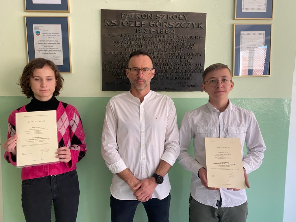 Uczeń klasy 8 Lucjan Piechówka z Szkoły Podstawowej w Pisarzowej oraz Antoni Juszczak z kl.8  z Szkoły Podstawowej w Młynnym uzyskali tytuł laureata, natomiast Zofia Frączek uczennica klasy 8 Szkoły Podstawowej w Pisarzowej została finalistką  Małopolskiego Konkursu Chemicznego.