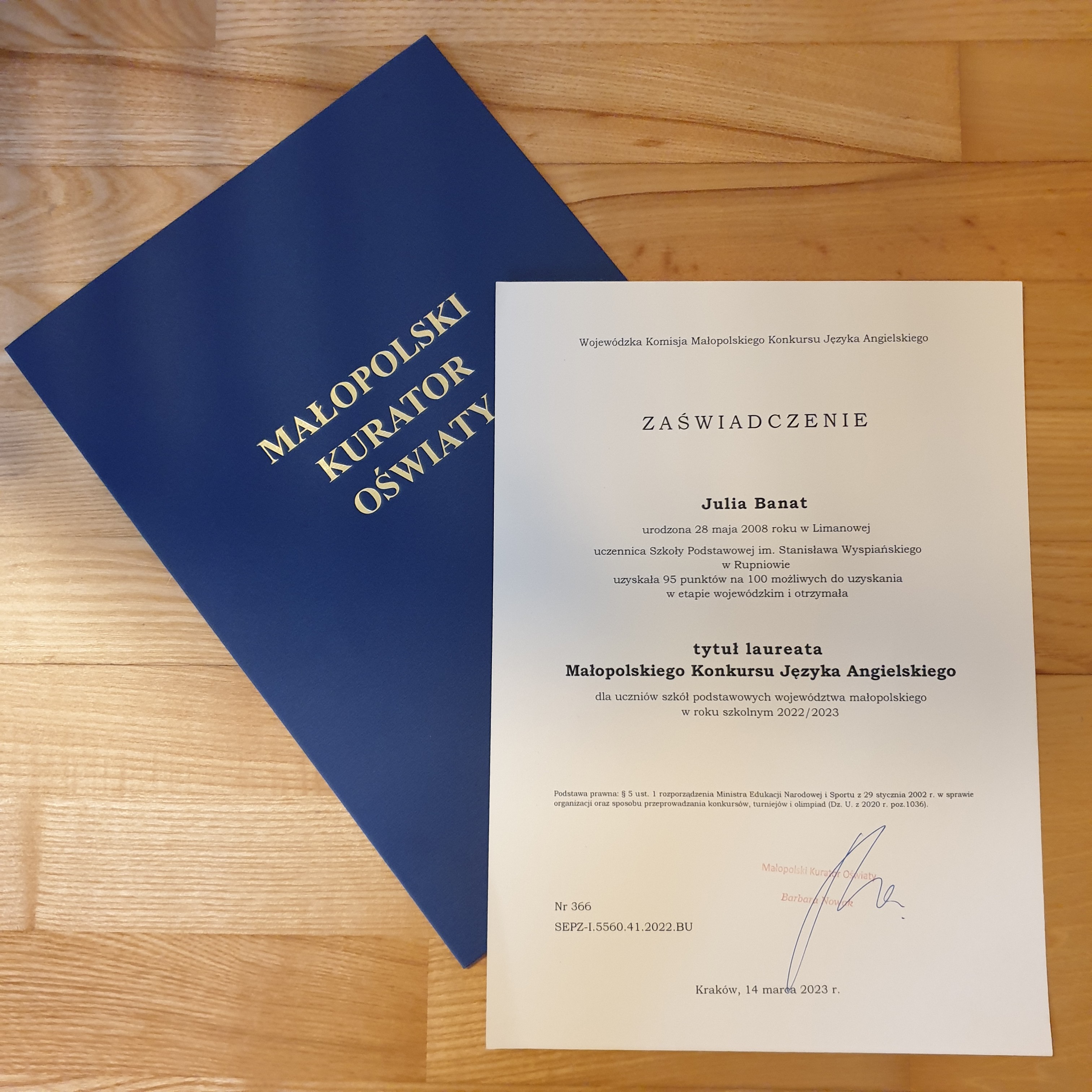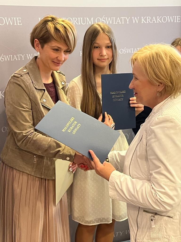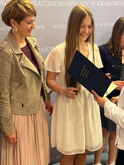 W ubiegłym tygodniu w auli Uniwersytetu Pedagogicznego w Krakowie odbyła się uroczysta gala zakończenia konkursów przedmiotowych, podczas której Julia z rąk pani wicekurator otrzymała zaświadczenie laureata.Z tytułem laureata związane są następujące przywileje: uczennica jest zwolniona z egzaminu ósmoklasisty.