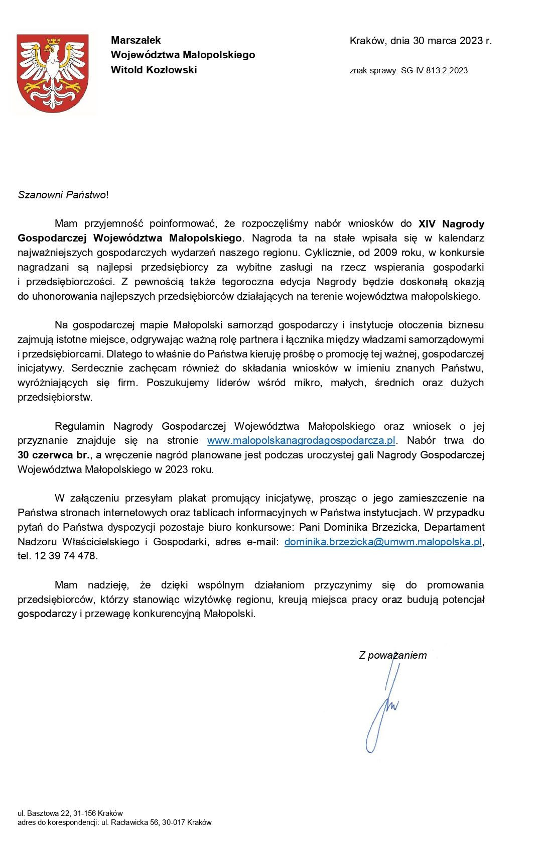 Mam nadzieję, że dzięki wspólnym działaniom przyczynimy się do promowania przedsiębiorców, którzy stanowiąc wizytówkę regionu, kreują miejsca pracy oraz budują potencjał gospodarczy i przewagę konkurencyjną Małopolski.