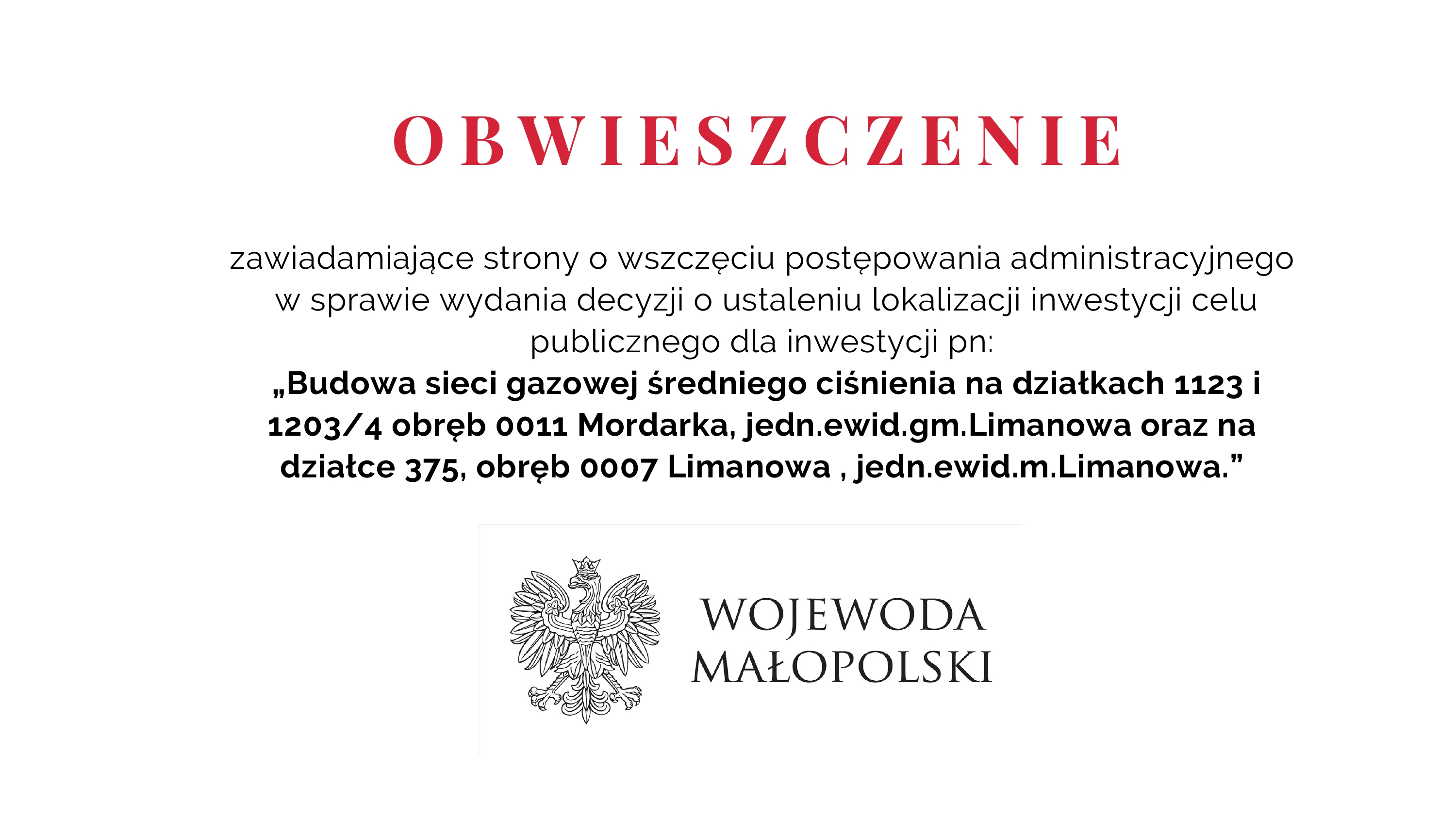 Przedkładamy Państwu do informacji Obwieszczenie Wojewody Małopolskiego dotyczące wszczęcia postępowania administracyjnego w sprawie wydania decyzji o ustaleniu lokalizacji inwestycji celu publicznego na „Budowe sieci gazowej średniego ciśnienia na działkach 1123 i 1203/4 obręb 0011 Mordarka, jedn.ewid.gm.Limanowa oraz na działce 375, obręb 0007 Limanowa , jedn.ewid.m.Limanowa.”