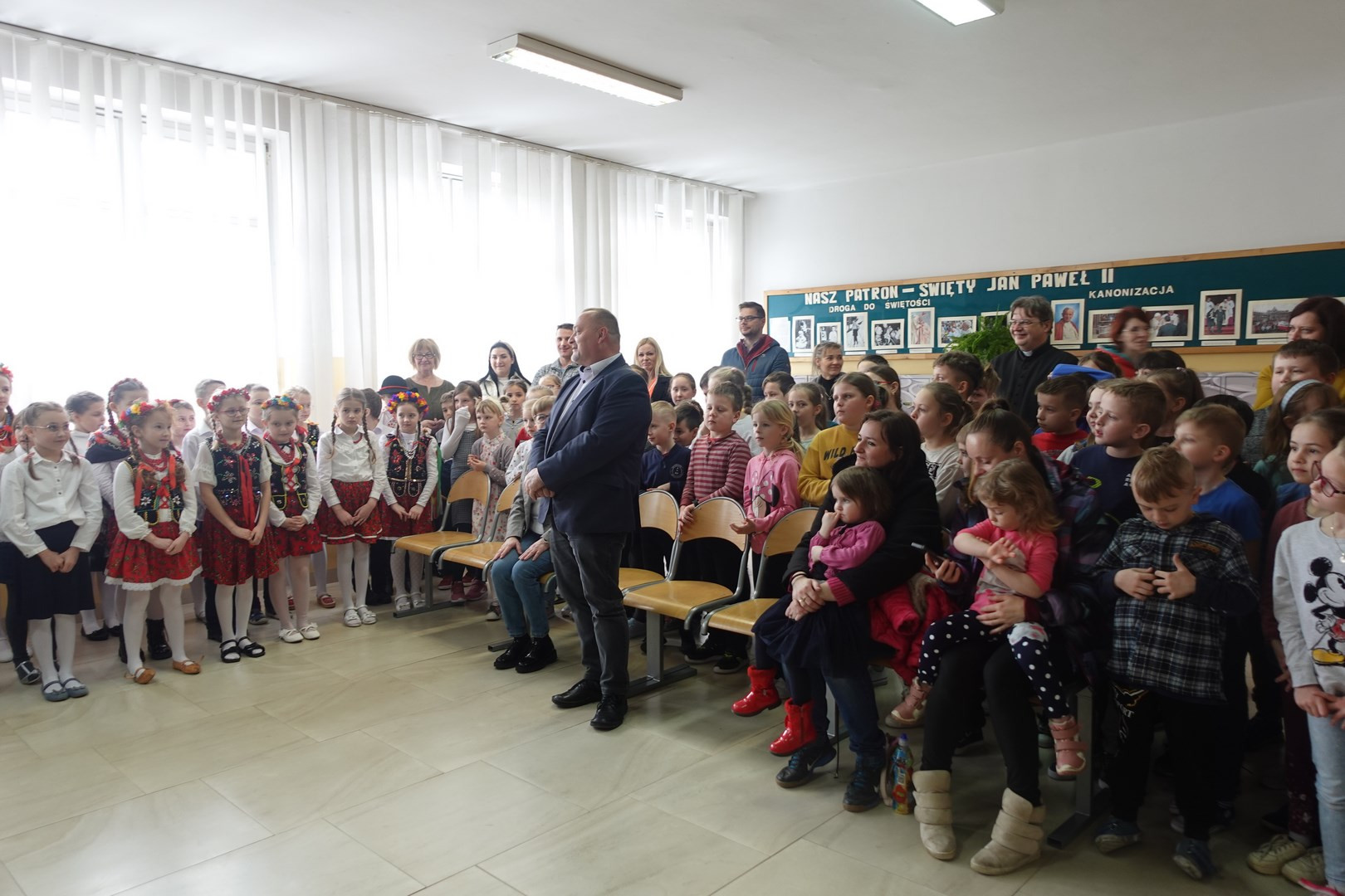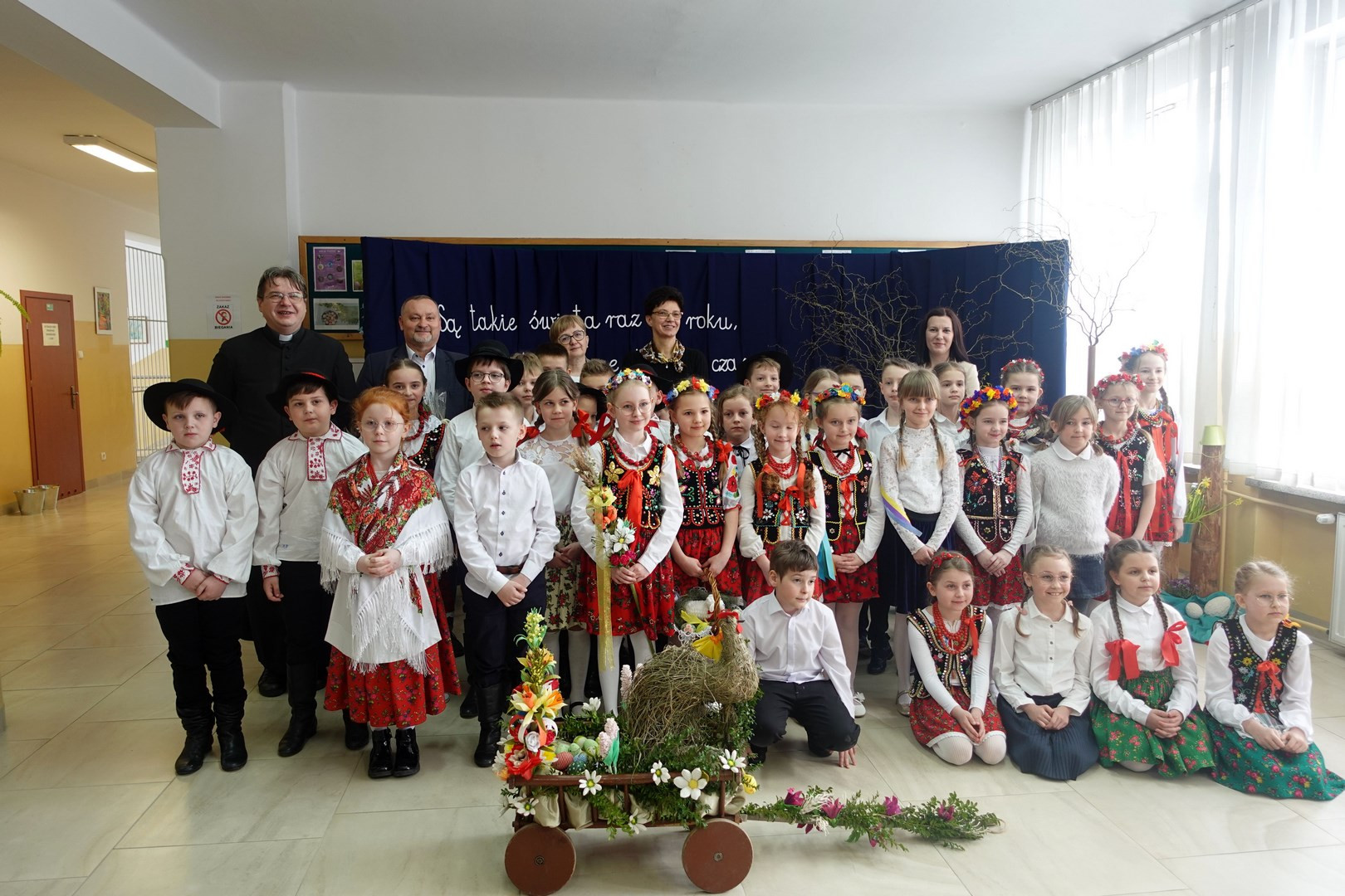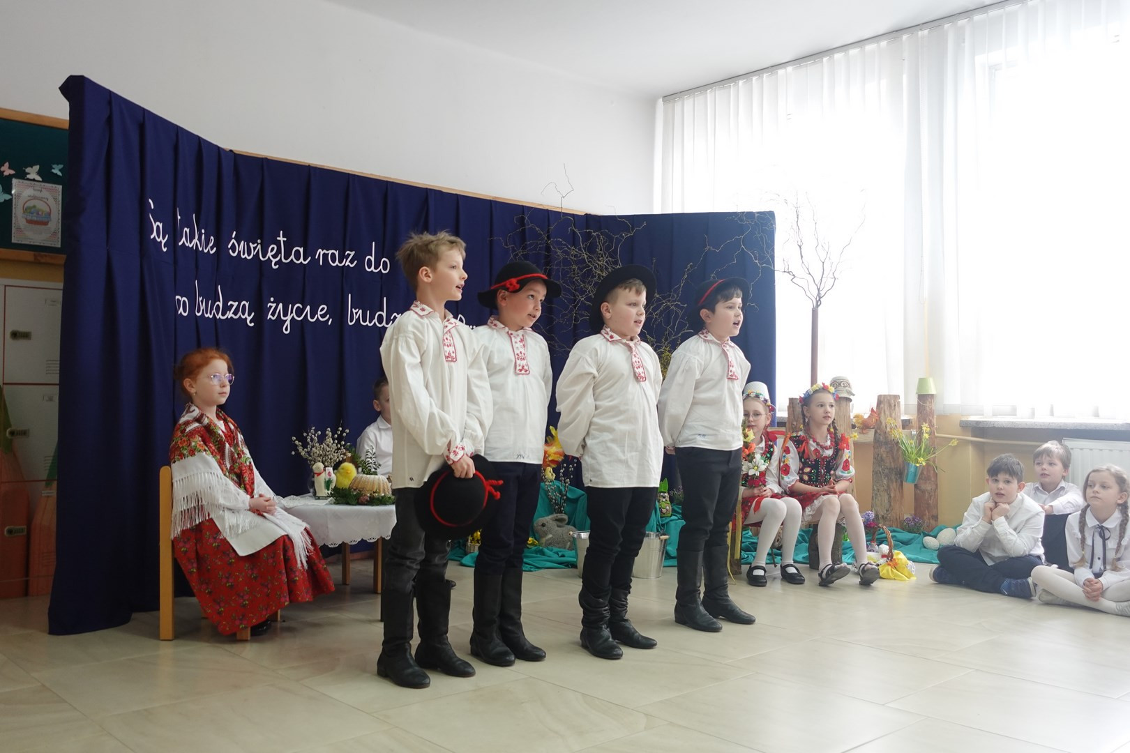 4 kwietnia w Szkole Podstawowej nr 1 im. Jana Pawła II w Męcinie dało się już odczuć atmosferę zbliżających się Świąt Wielkanocnych. Stało się tak dzięki okolicznościowemu przedstawieniu przygotowanemu przez drugoklasistów w ramach innowacji pedagogicznej „W świecie sztuki – teatru i malarstwa”. W tym wyjątkowym dniu występ małych adeptów sztuki teatralnej zaszczycili swoją obecnością: Dyrektor – Grzegorz Krzak, Wicedyrektor – Beata Jabłońska, ks. Witold Machalski, nauczyciele, rodzice oraz dzieci z klas I – III. W czasie spektaklu, którego myślą przewodnią było przypomnienie tradycji ludowych, dzieci recytowały wiersze o tematyce świątecznej, a także śpiewały piosenki, doskonale wprowadzając widzów w wyjątkowy czas Wielkanocy.
