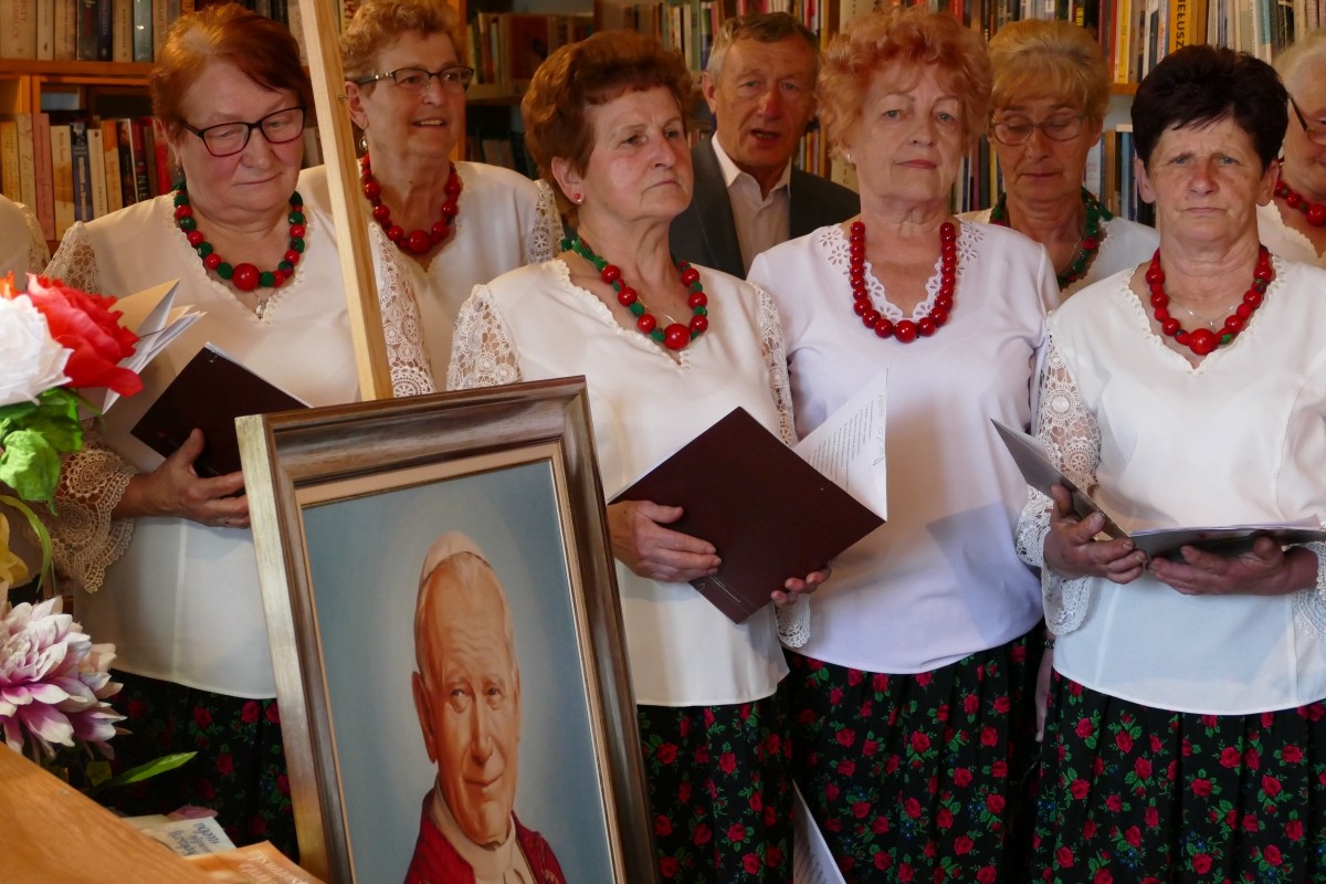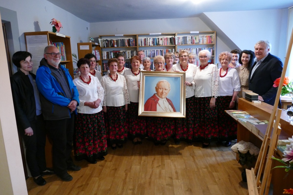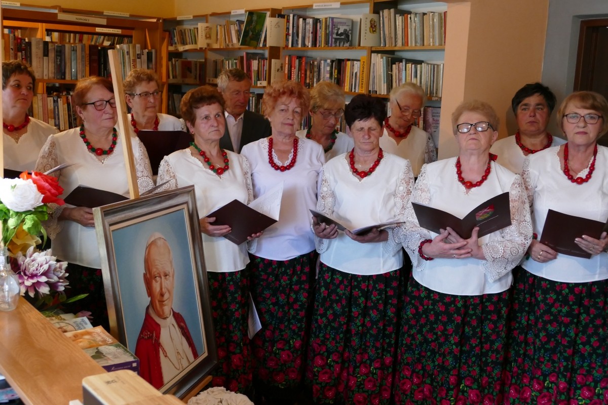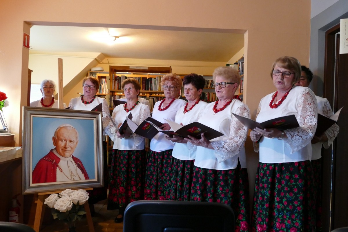 Spotkanie zostało przygotowane w ramach XXII Małopolskich Dni Książki – „Książka i Róża”. Spotkanie przebiegło w kameralnym gronie.Spektakl przygotował Zespół Seniorów z Męciny ,,Tradycja” pod kierunkiem znanej artystki, Stanisławy Oleksy. Ze sceny popłynęły pieśni związane z Ojcem Świętym, przeplatane wierszami. Podniosła i wzruszająca atmosfera udzieliła się wszystkim zebranym. Nie zabrakło także ,,Barki”, piosenki, którą papież szczególnie ukochał. Publiczność była zachwycona koncertem. Widzowie podkreślali, że niektóre utwory skłaniały do refleksji i zastanowienia się nad życiem. Animuszu występującym dodawały przepiękne stroje z regionalnym akcentem. Po występie Seniorów, wiersze autorstwa papieża odczytał dyrektor biblioteki, Jacenty Musiał, Maria Trzupek – inspektor do spraw realizacji zadań Biblioteki Powiatowej oraz Krystyna Trzupek, bibliotekarka z Męciny. Na koniec wszyscy zebrani wspólnie odśpiewali kilka popularnych kawałków, często śpiewanych podczas pielgrzymek Karola Wojtyły do Polski.