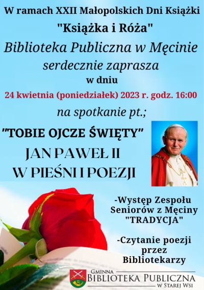 Małopolskie Dni Książki "Książka i Róża" to wielkie święto czytelnictwa i wszystkich, którzy kochają literaturę.To także okazja do spotkań w kręgu książki i autorów. Gminna Biblioteka Publiczna w Starej Wsi już po raz kolejny bierze udział w Małopolskich Dniach Książki „Książka i Róża”. Z tej okazji  Biblioteka w Męcinie zaprasza 21 kwietnia (poniedziałek) na godz. 16.00 na spektakl słowno-muzyczny poświęcony Janowi Pawłowi II pt.:,,Tobie Ojcze Święty. Jan Paweł II w pieśni i poezji".Spotkanie uświetni Zespół Seniorów z Męciny,,Tradycja" oraz czytanie przesłania Papieża przez Bibliotekarzy.