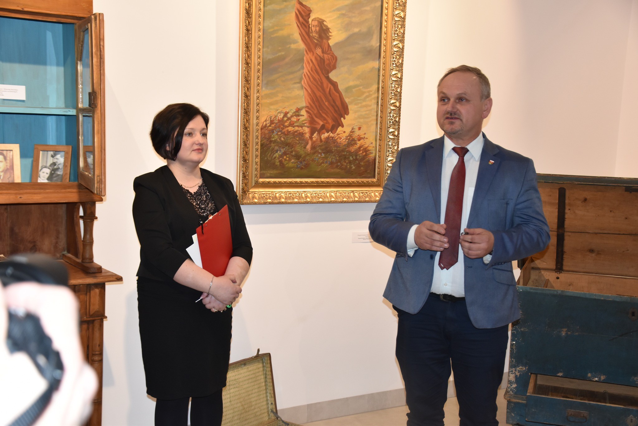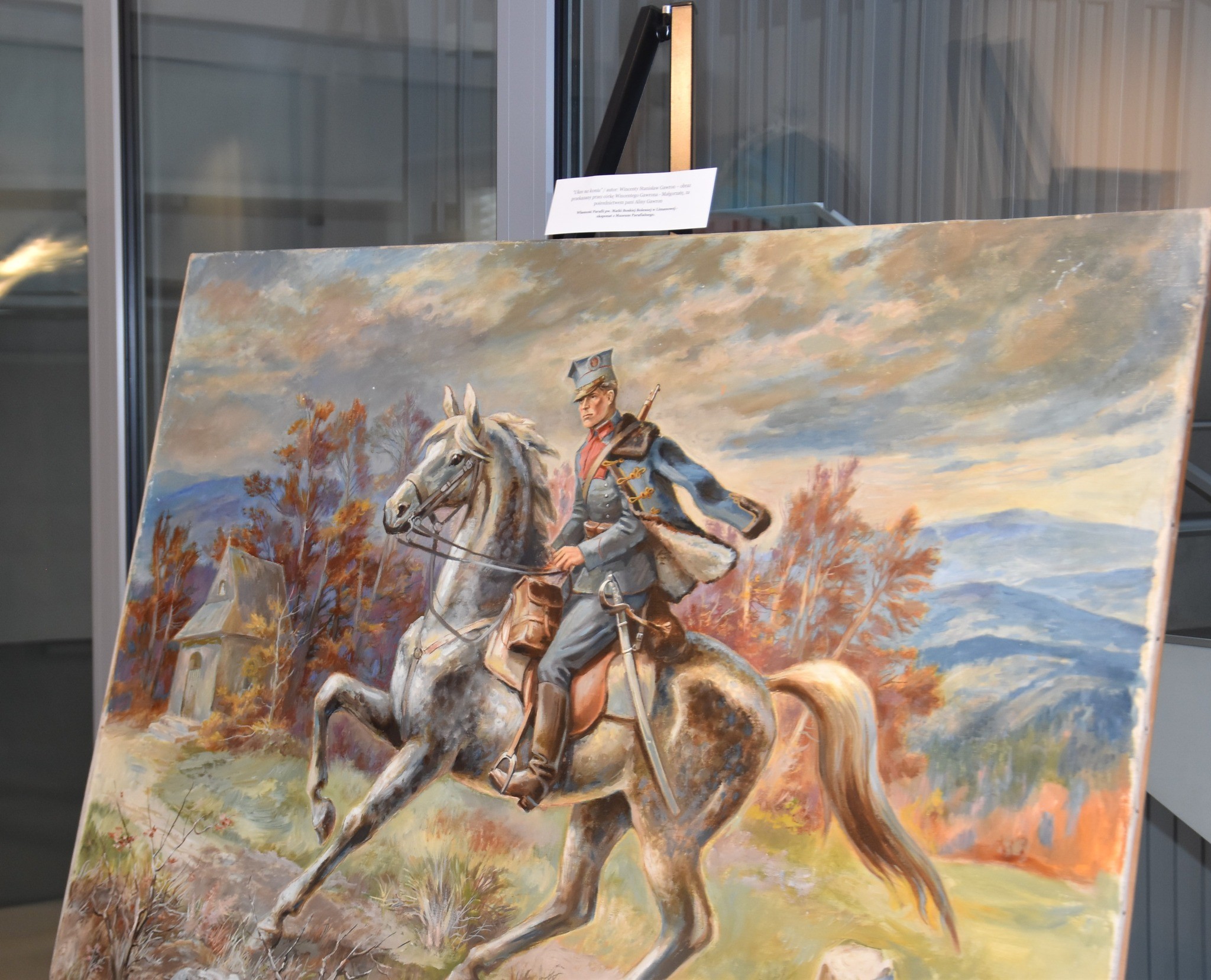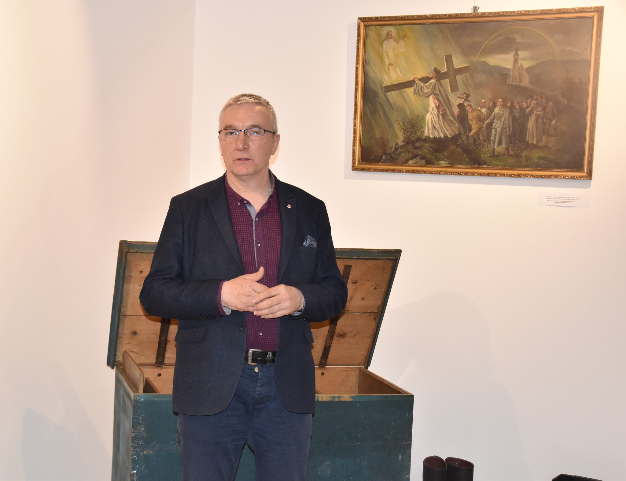 Wójt Gminy Limanowa Jan Skrzekut. Ekspozycję można oglądać do 19 maja w godzinach pracy biblioteki.