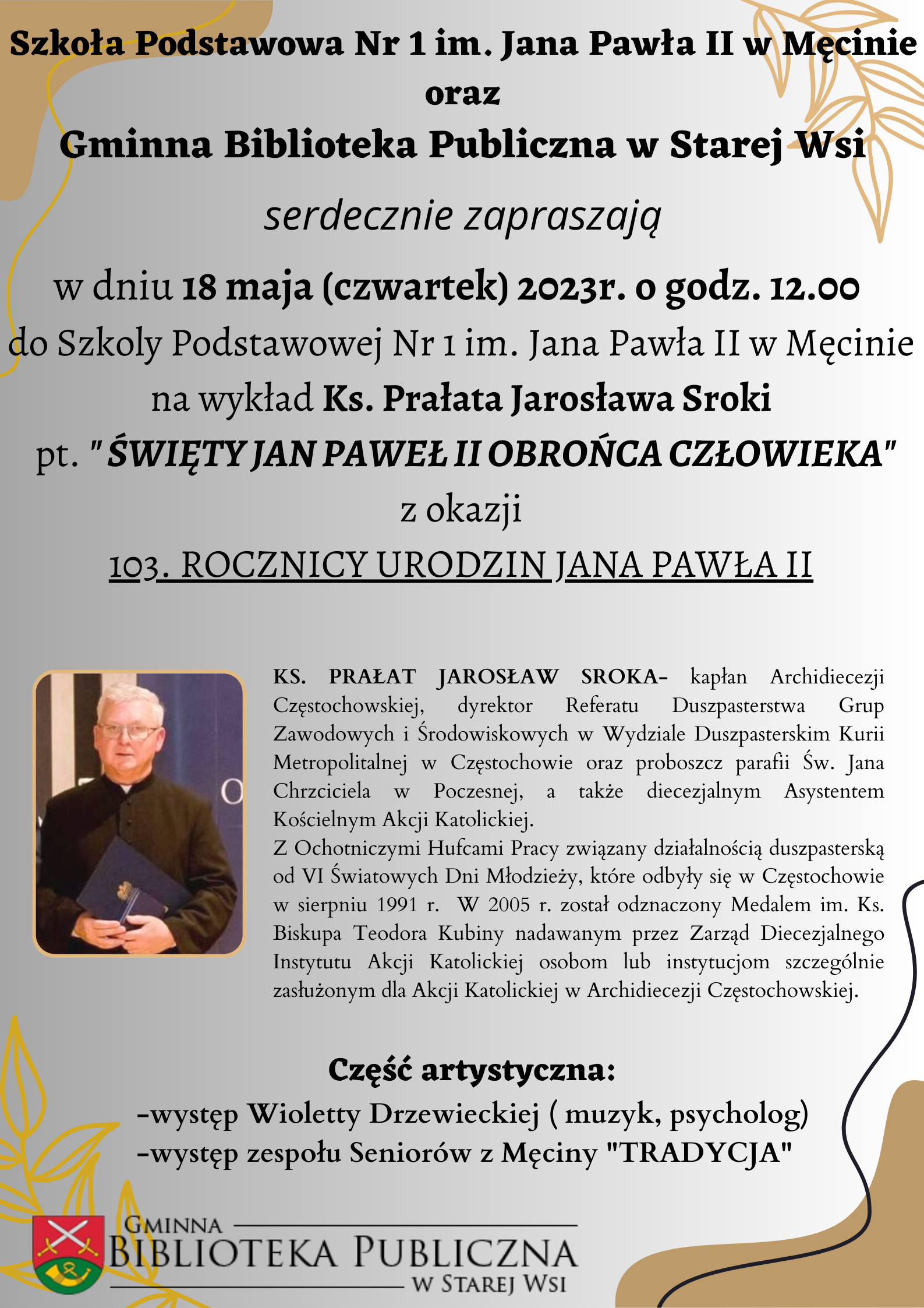 W imieniu Organizatorów Serdecznie Zapraszamy na wykład ks.prałata Jarosława Sroki pt " Św Jan Paweł II Obrońca Człowieka"