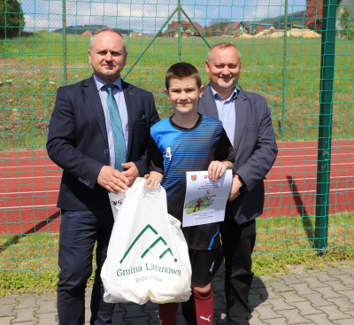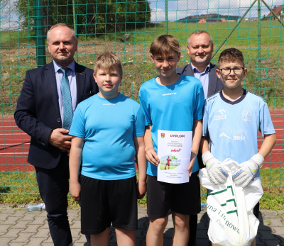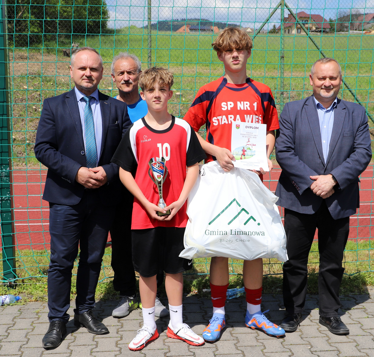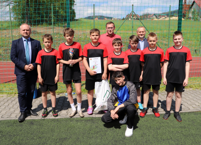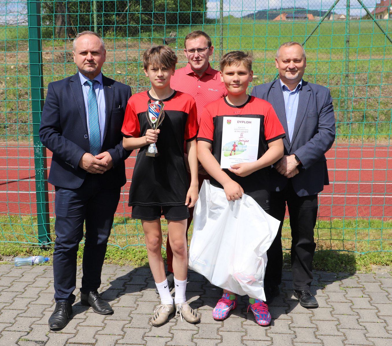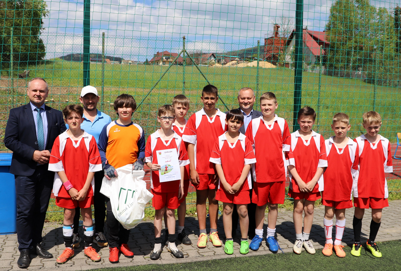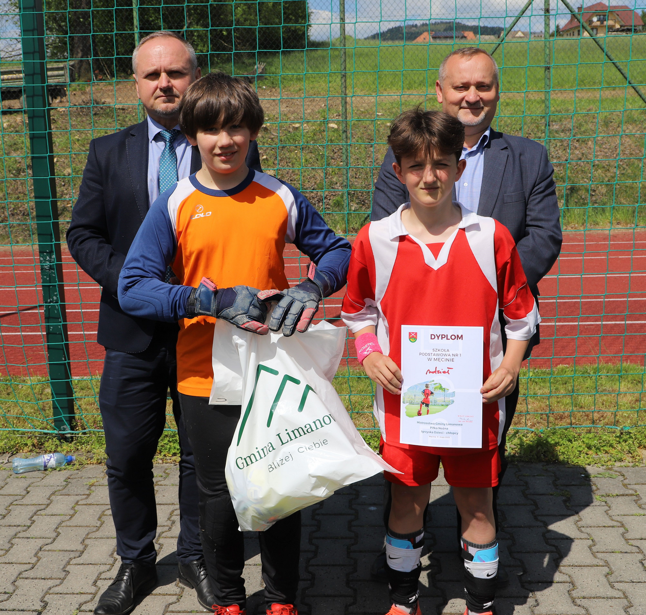 Wręczenia nagród oraz pucharów uczestnikom rozgrywek piłkarskich dokonał Wójt Gminy Limanowa Jan Skrzekut i Dyrektor Szkoły Podstawowej nr 1 w Męcinie Grzegorz Krzak.