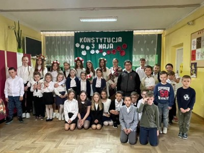 Na zakończenie cała społeczność uczniowska wraz z nauczycielami odśpiewała z entuzjazmem radosną pieśń „Witaj, majowa jutrzenko”. Uroczystość przygotowali nauczyciele Krystyna Raszek, Iwona Pasiut,Katarzyna Ziaja.