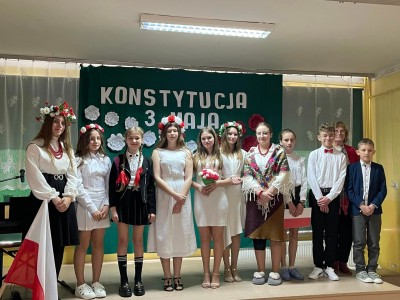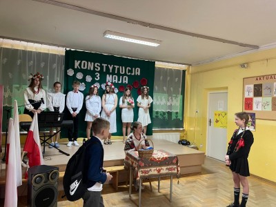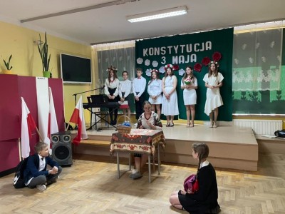 To ważne święto należy do najradośniejszych wśród polskich uroczystości. Uczniowie starszych klas przybliżyli swoim młodszym kolegom wiadomości o pierwszej w Europie, a drugiej na świecie (po amerykańskiej) ustawie zasadniczej. Istotę polskiej Konstytucji 3 Maja i okoliczności jej uchwalenia wyjaśniła scenka ukazująca współczesną rodzinę: dzieci, po powrocie ze szkoły, relacjonują szkolne wydarzenie, jakim była akademia i pytają swej babci o zagadnienia związane z uchwaloną ustawą.