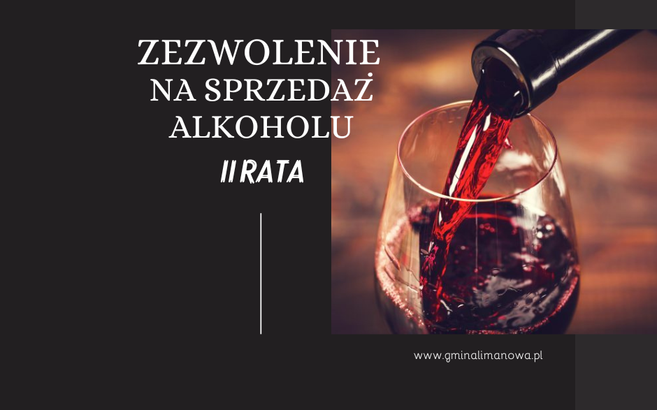 Urząd Gminy Limanowa - Wydział Organizacyjny przypomina Przedsiębiorcom prowadzącym sprzedaż napojów alkoholowych na podstawie zezwoleń wydanych przez Wójta Gminy Limanowa, że do dnia 31 maja 2023 r. należy wnieść na rachunek Urzędu Gminy opłatę za korzystanie z zezwolenia na sprzedaż napojów alkoholowych