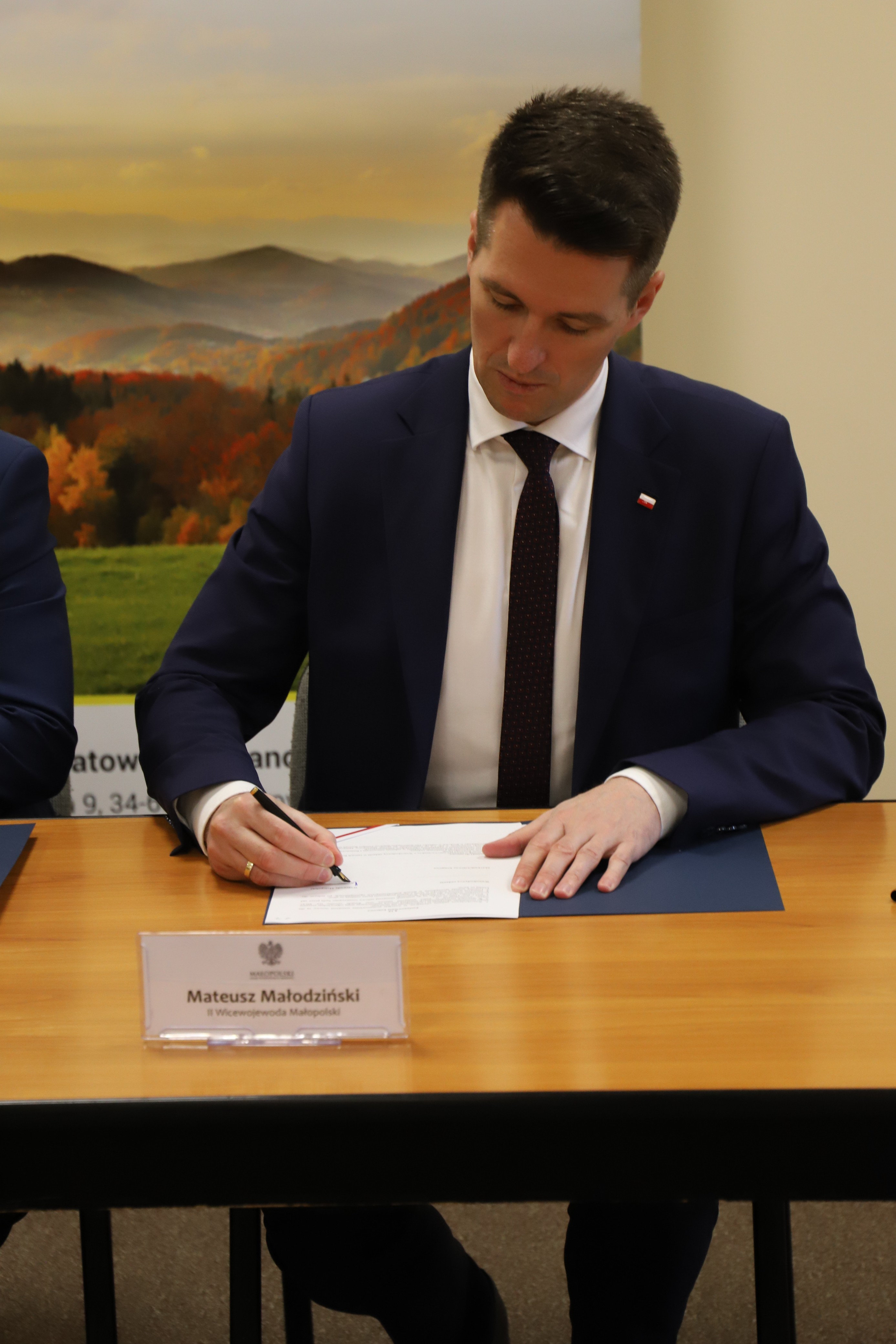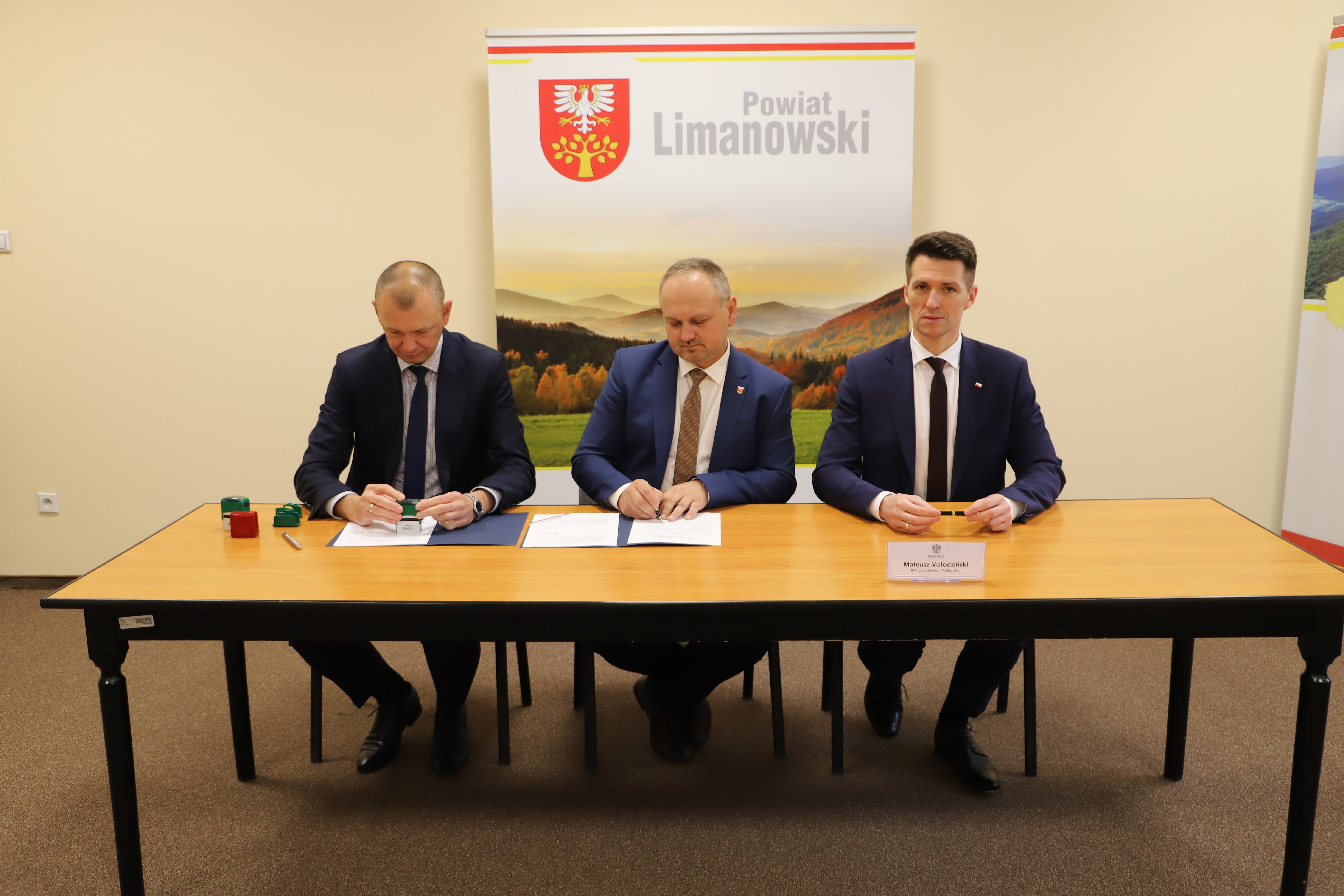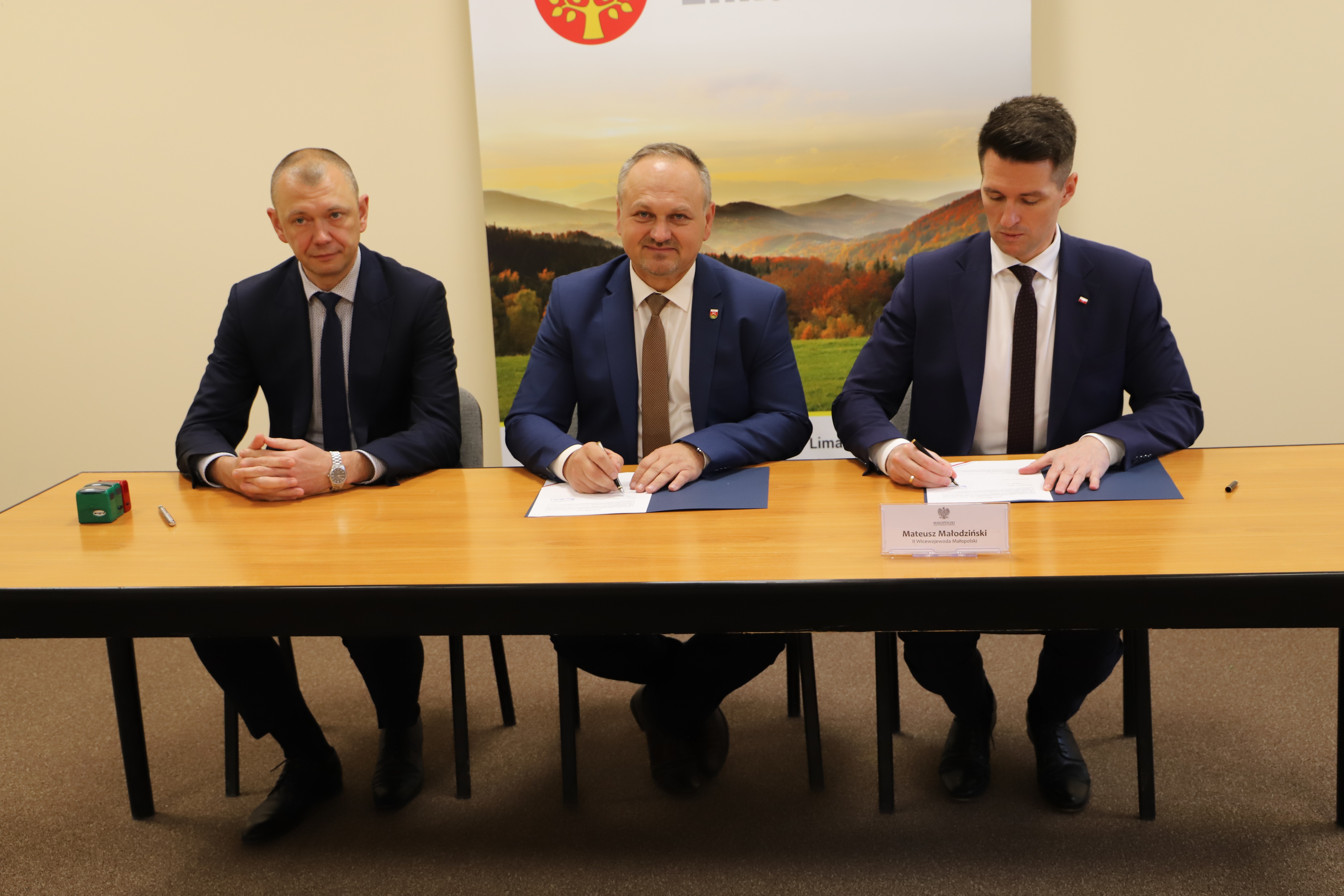 W podpisaniu umowy uczestniczyli II Wicewojewoda Małopolski Mateusz Małodziński, Wójt Gminy Limanowa Jan Skrzekut oraz Skarbnik Gminy Limanowa Marcin Matras.