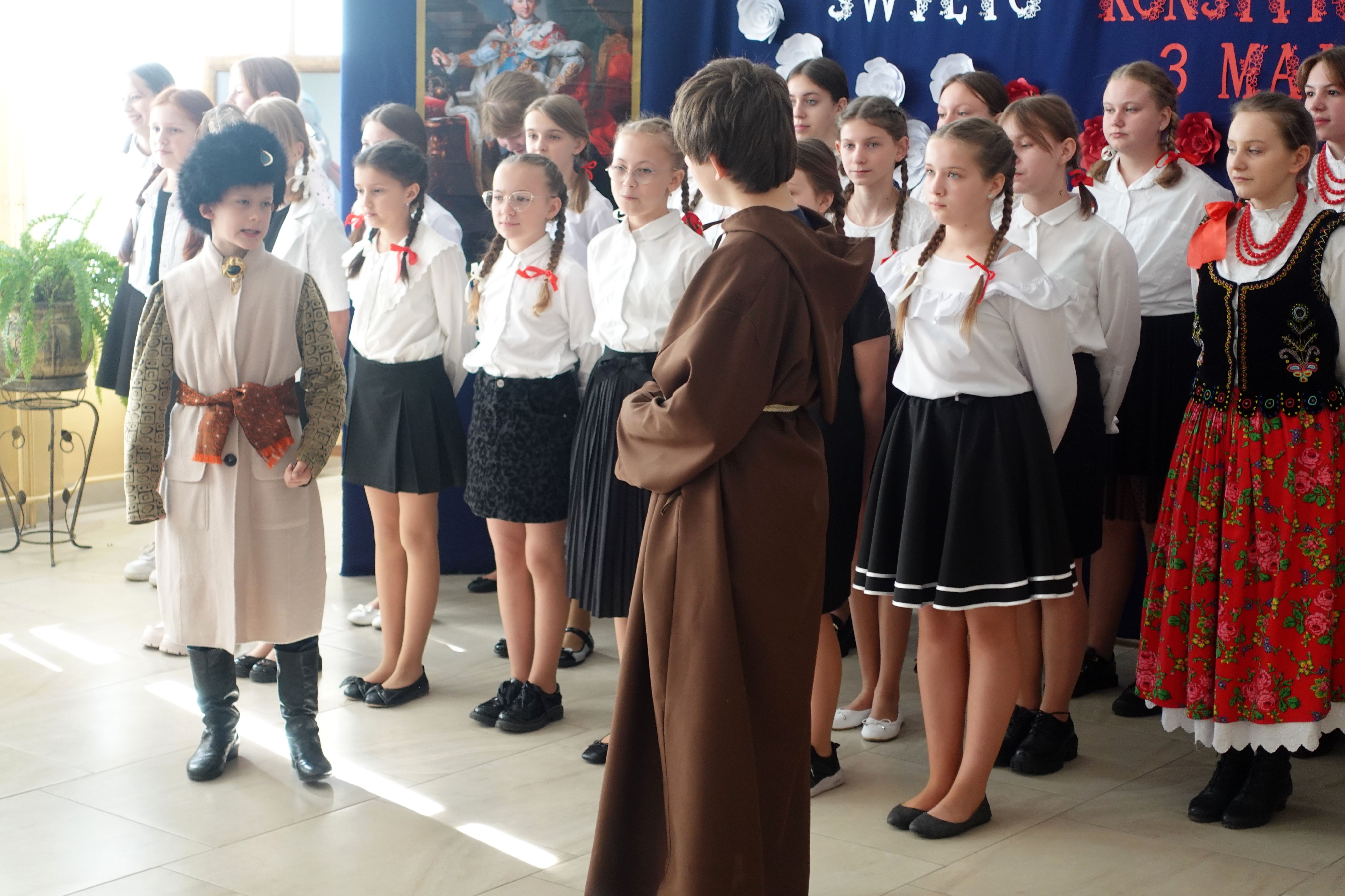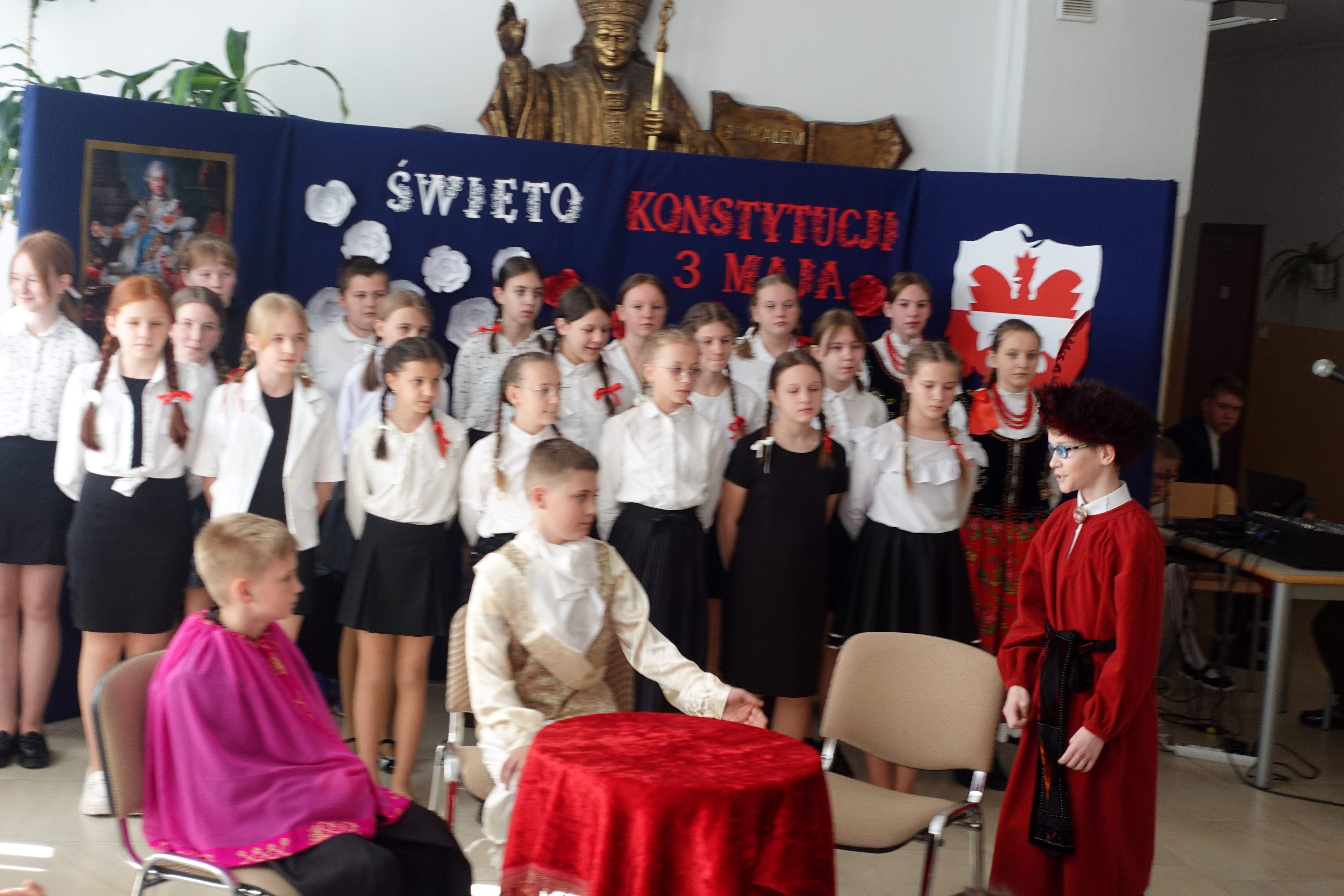 Z inscenizacji wybrzmiało znaczenie uchwalonej Konstytucji dla całego narodu. Całość uzupełniały odpowiednio dobrane kostiumy, pięknie zaśpiewane piosenki, recytacja wiersza oraz solowe wykonanie utworu na skrzypcach - Witaj Majowa Jutrzenko. Zarówno wiersz jak i utwór na skrzypcach zaprezentowały uczennice klasy 3b.