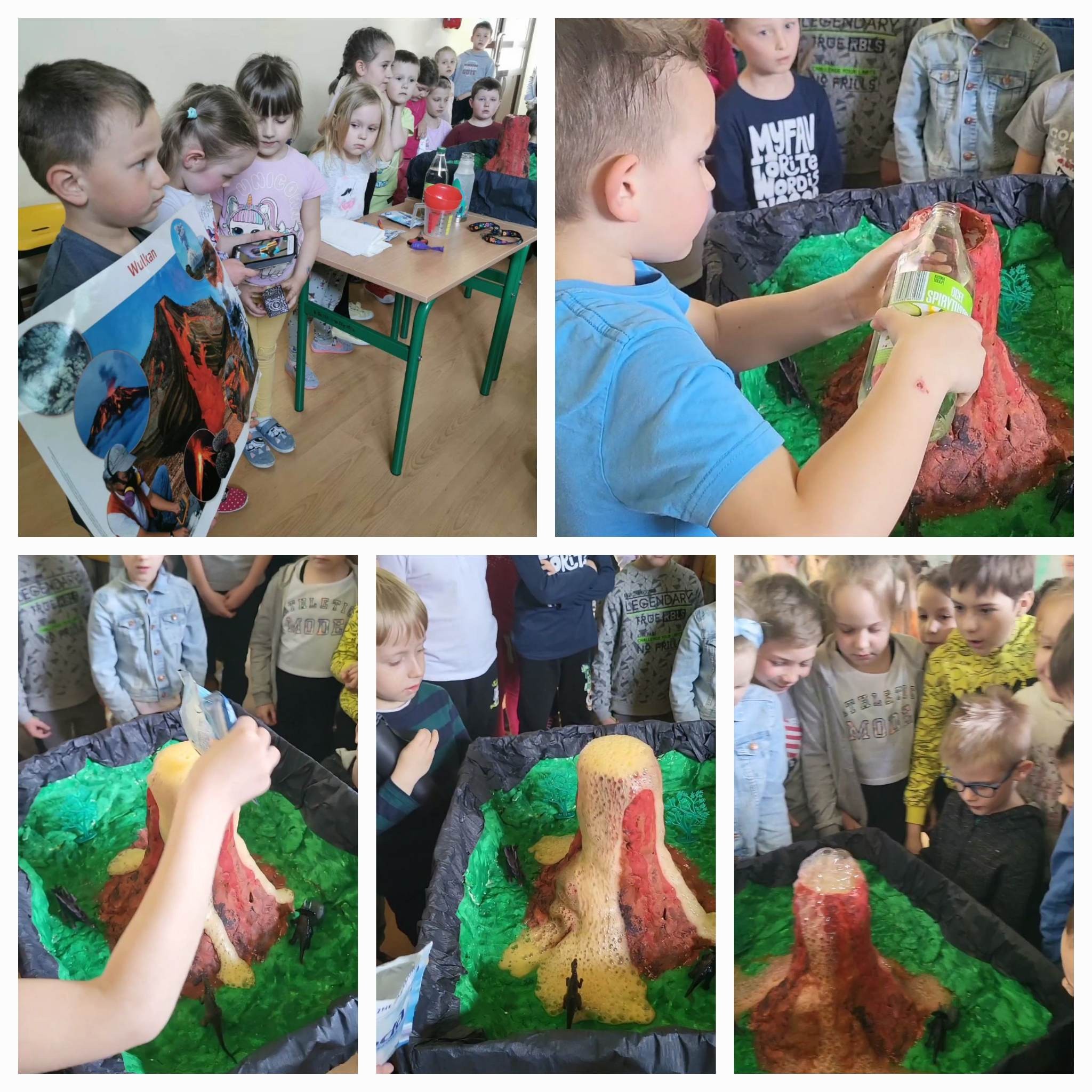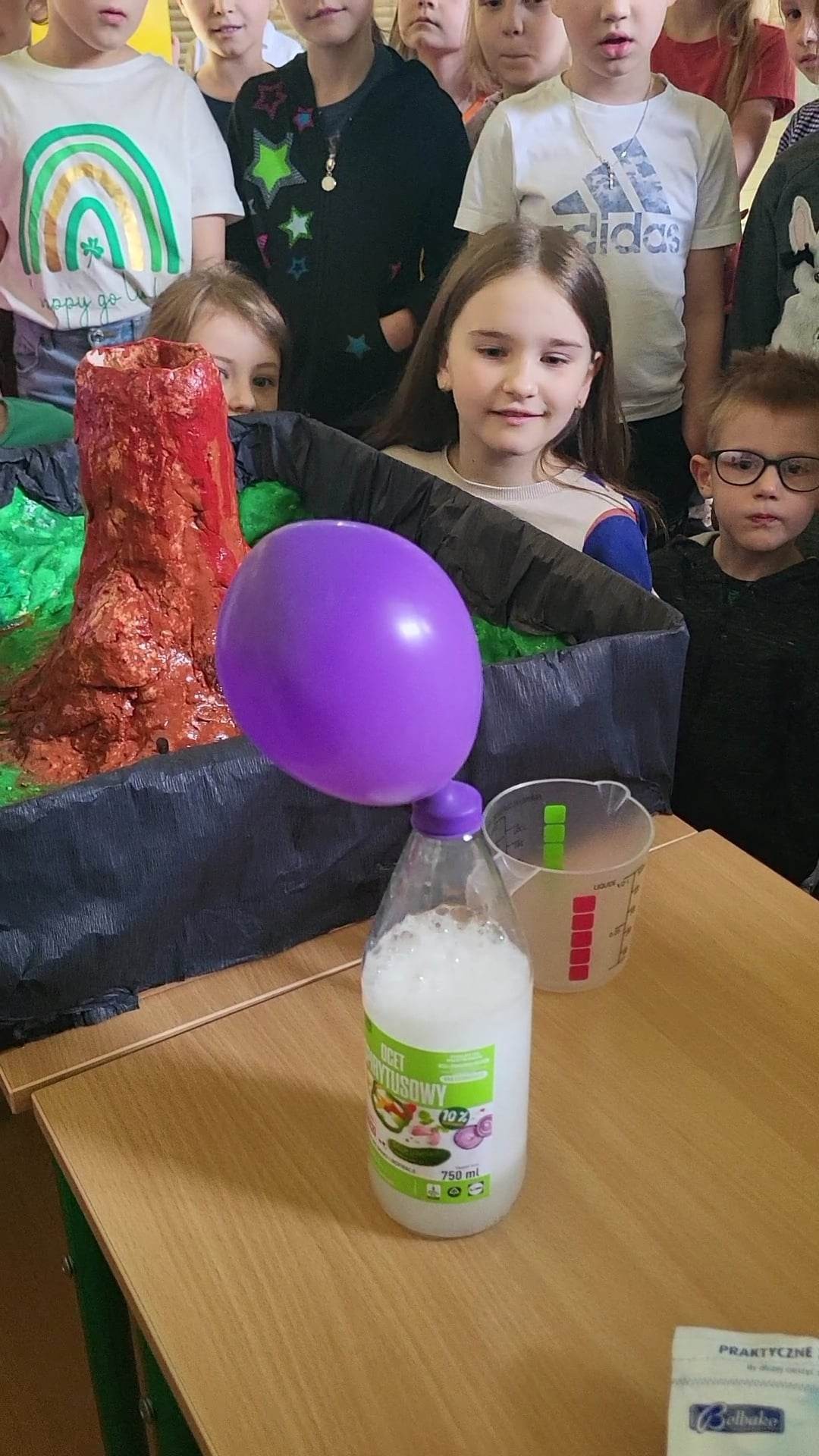 Przedszkolaki z klasy 0c przygotowały makietę wulkanu, następnie na hali szkolnej, przed zgromadzoną publicznością, dzieci wykonały eksperyment obrazujący wybuch wulkanu. W trakcie prezentacji wykorzystana została także kostka Merge Cube, dzięki której mogliśmy jeszcze lepiej poznać budowę wulkanu. Dzieci z klas 0a i 0b zapoznały się z budową drukarki 3D. Wykonały również własny wydruk. Przedszkolaki przeprowadziły także szereg ciekawych eksperymentów, m.in.: pompowanie balonu za pomocą octu i sody, hodowanie kryształów soli, balony w strumieniu powietrza.