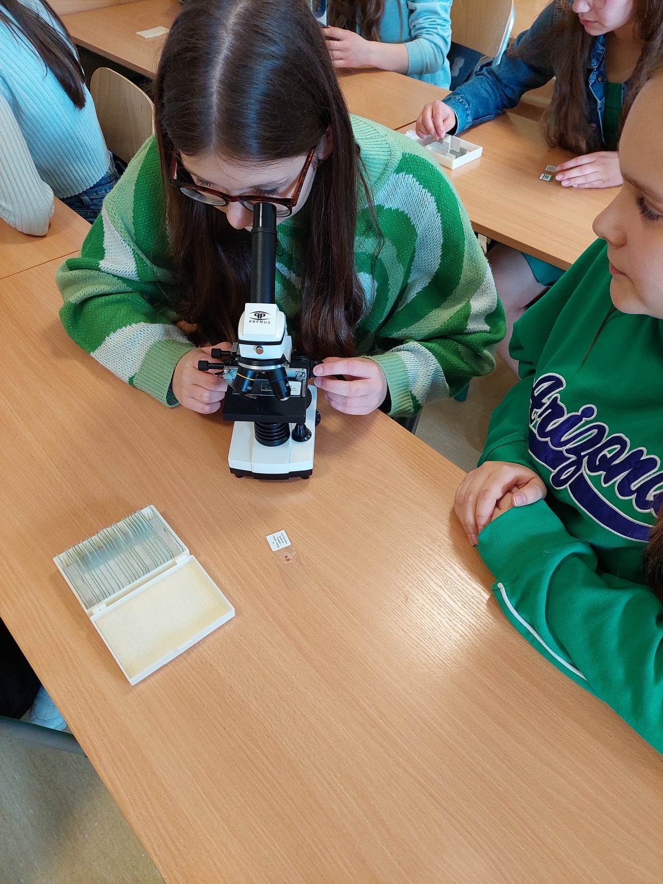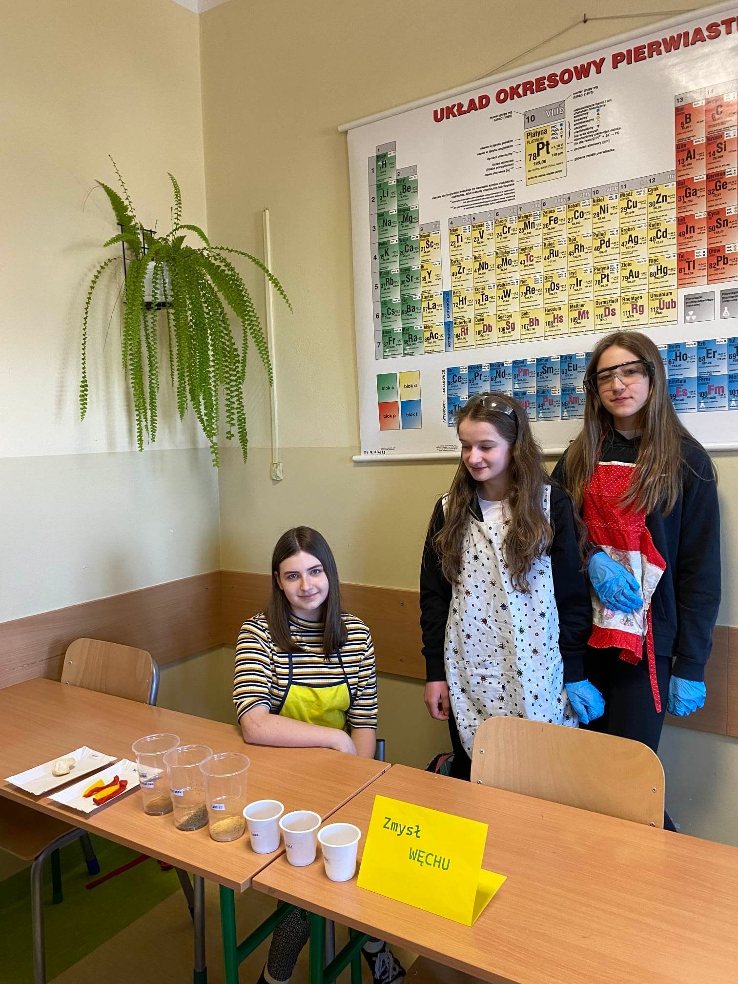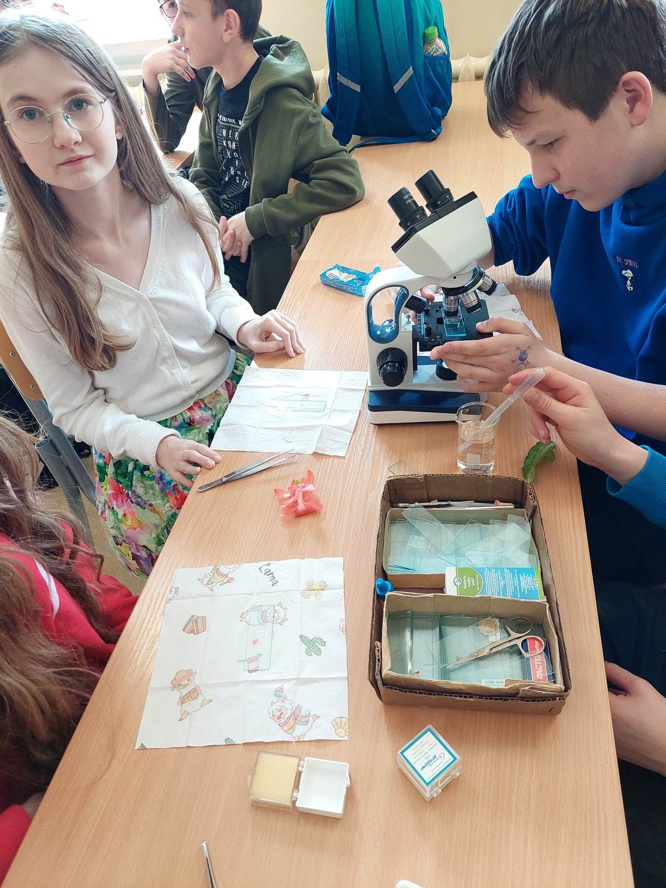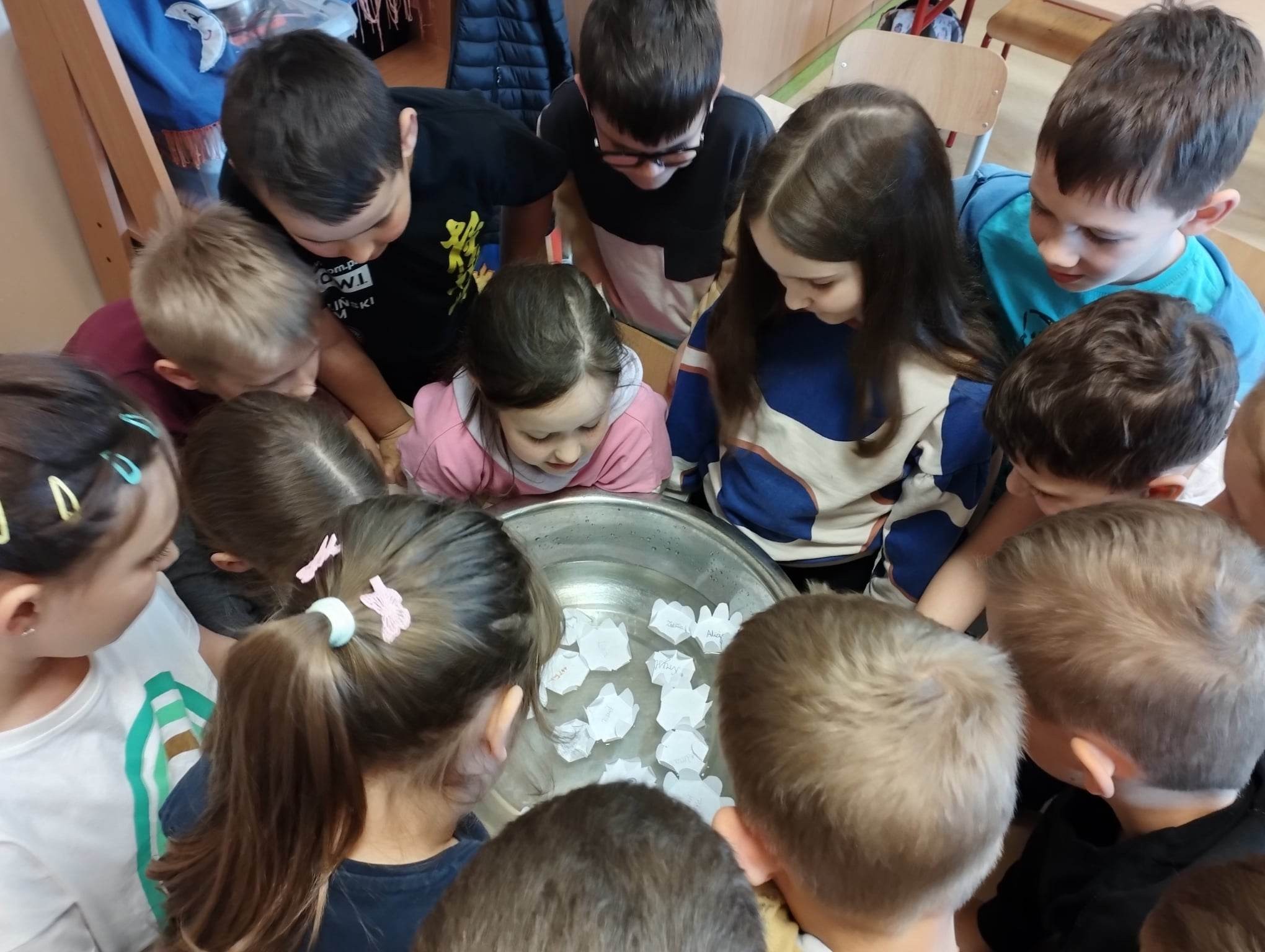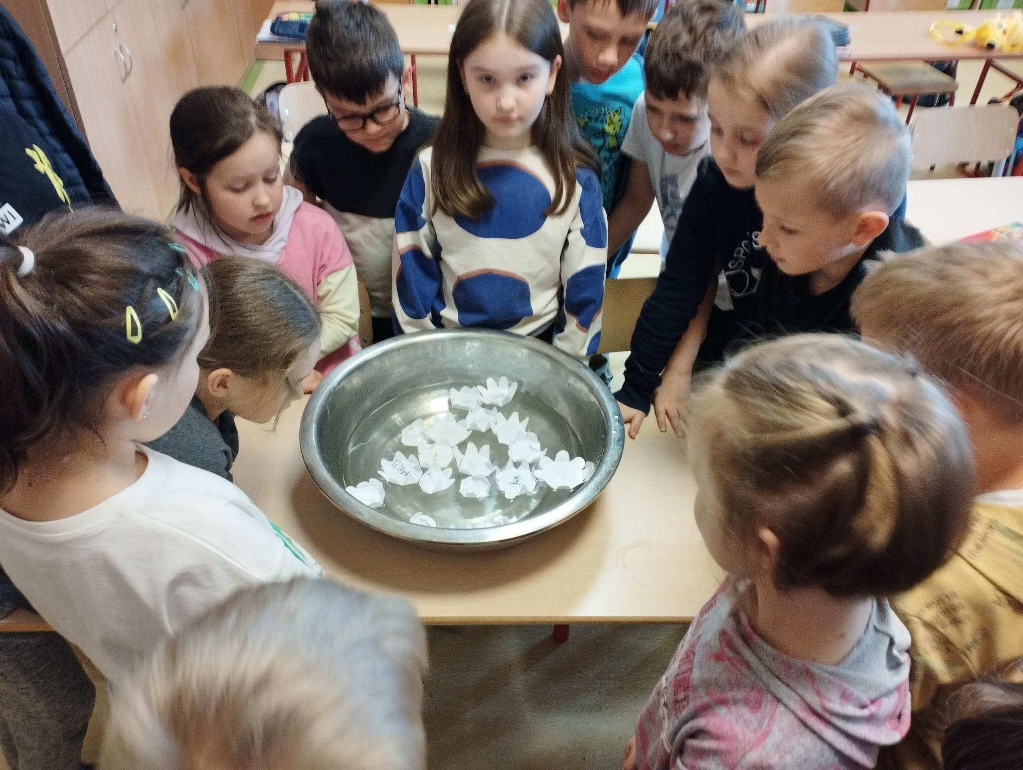 Dzieci z klasy 1a wykonały eksperymenty: „tęcza na talerzu”, „uciekający pieprz”- czyli jak mydło przegania zarazki , „balonowy szaszłyk” – czyli wykałaczka w balonie, dmuchanie balonu za pomocą sody i octu, badali gęstość wody, wykorzystując do tego jajko. Klasa 1b wykonała eksperyment „rozkwitające kwiaty”. Uczniowie klasy 0c, 1b, 2a zapoznali się również z budową mikroskopu. Dzieci dowiedziały się co jest potrzebne, aby zrobić preparat mikroskopowy oraz obserwowały pod mikroskopem łodygę fasoli.