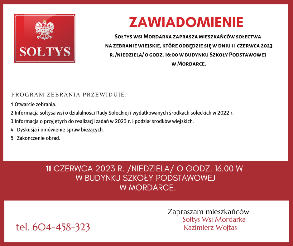 Sołtys wsi Mordarka zaprasza mieszkańców sołectwa na zebranie wiejskie, które odbędzie się w dniu 11 czerwca 2023 r. /niedziela/ o godz. 16:00 w budynku Szkoły Podstawowej w Mordarce.
