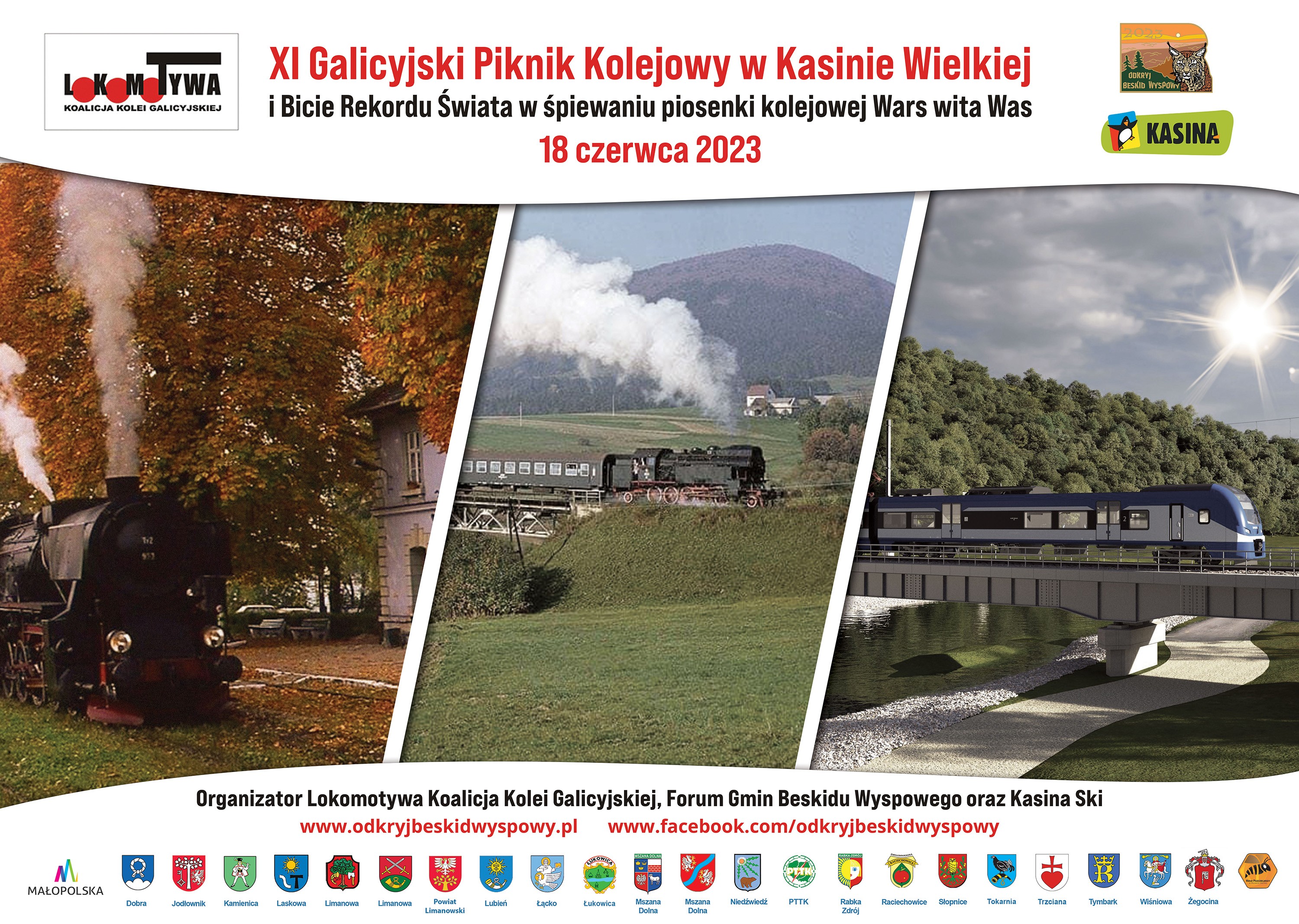 Serdecznie zapraszamy na obchody 140 rocznicy Galicyjskiej Kolei Transwersalnej, które odbędą się 18 czerwca 2023 roku oraz na XI Galicyjski Piknik Kolejowy w Kasinie Wielkiej. Organizatorami wydarzenia są : Forum Gmin Beskidu Wyspowego,Towarzystwo Miłośników Regionu Dobrzańskiego, Gmina Mszana Dolna,Lokomotywa Koalicja Kolei Galicyjskiej , Kasina Ski