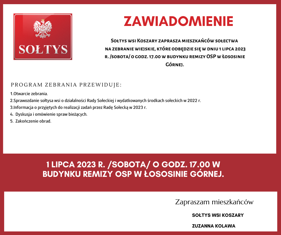 Sołtys wsi Koszary zaprasza mieszkańców sołectwa na zebranie wiejskie, które odbędzie się w dniu 1 lipca 2023 r. /sobota/ o godz. 17.00 w budynku remizy OSP w Łososinie Górnej.