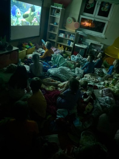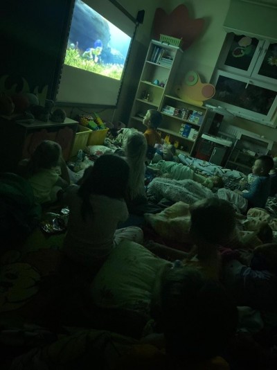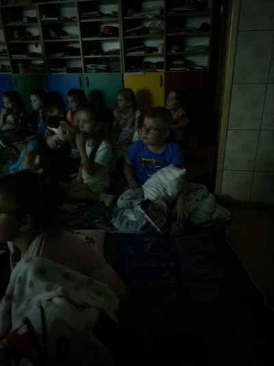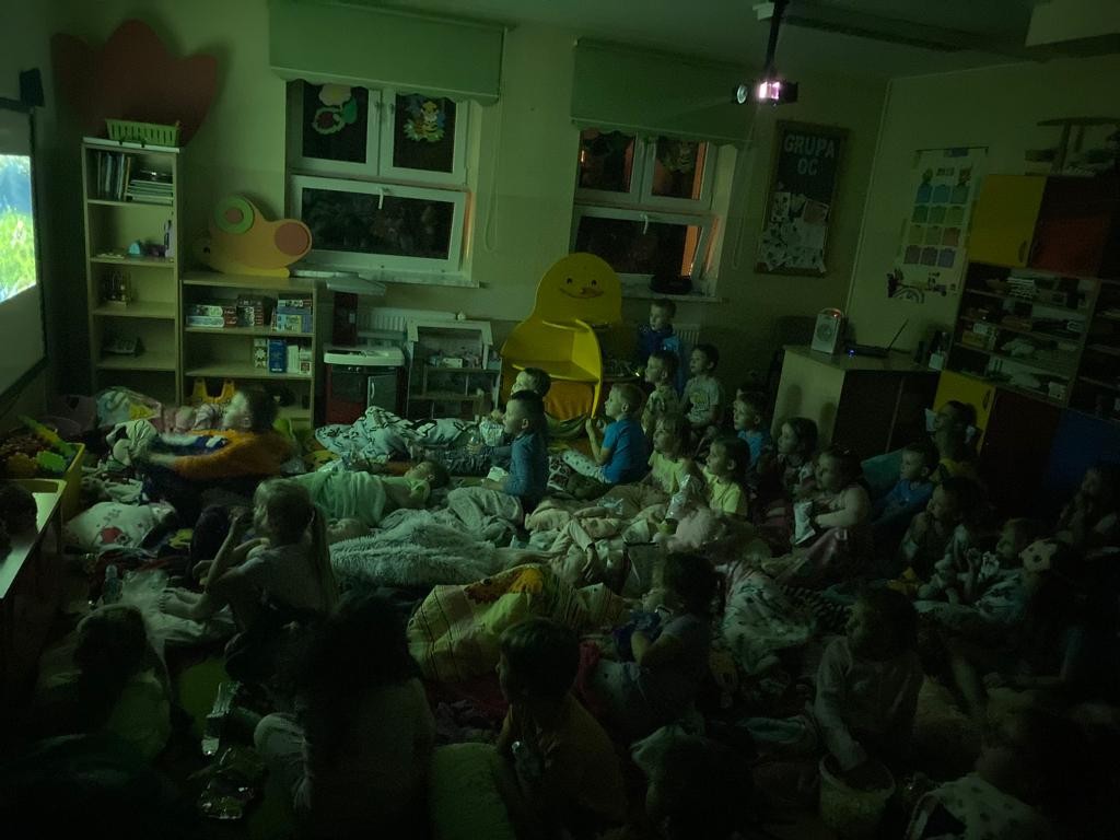 Następnie przyszła pora na wieczorne szaleństwa na placu zabaw ,ile było radości aż trudno opisać nikt wcześniej z przedszkolaków o tej porze nie miał okazji korzystać z przedszkolnego placu zabaw i to w takim składzie! Kiedy dzieci dały upust energii magazynowanej od samego rana, nadeszła pora na zabawy swobodne z wykorzystaniem swoich ulubionych zabawek przyniesionych z domu, a następnie pora na kolejny punkt wieczoru: dyskotekę na sali gimnastycznej z wykorzystaniem kolorowych świateł . Przy dźwiękach muzyki, którą dzieci same wybierały, wszyscy bawili się znakomicie - tym bardziej, że za oknami było już ciemnooooo! Kiedy zmęczenie dało o sobie znać przyszła kolej na założenie piżamek.Wszyscy podziwiali swoje stroje na seans filmowy, po czym milusińscy zabrali przyniesione smakołyki, ułożyli się wygodnie na materacu, otulili milutkim kocykiem i cierpliwie czekali na rozpoczęcie "seansu kinowego". Nie trudno się domyślić, że niektórym - po tym wieczorze pełnym atrakcji oraz emocji - nie udało się obejrzeć filmu do końca....zmęczenie dało się we znaki .
