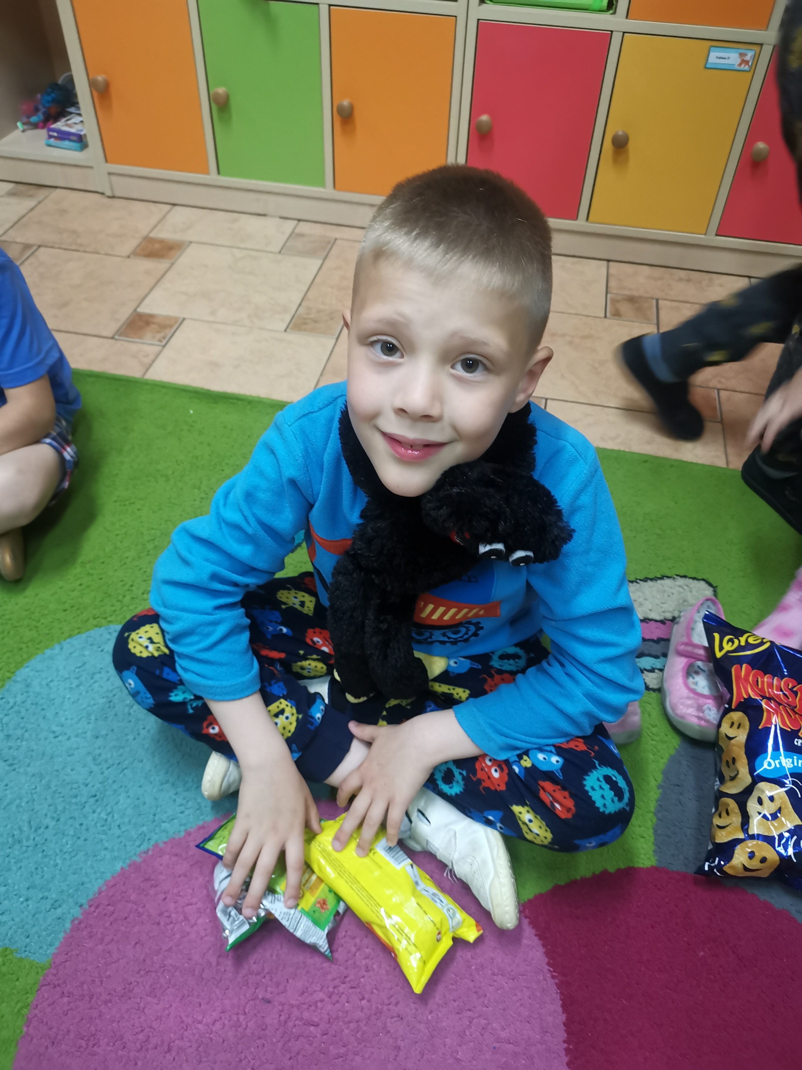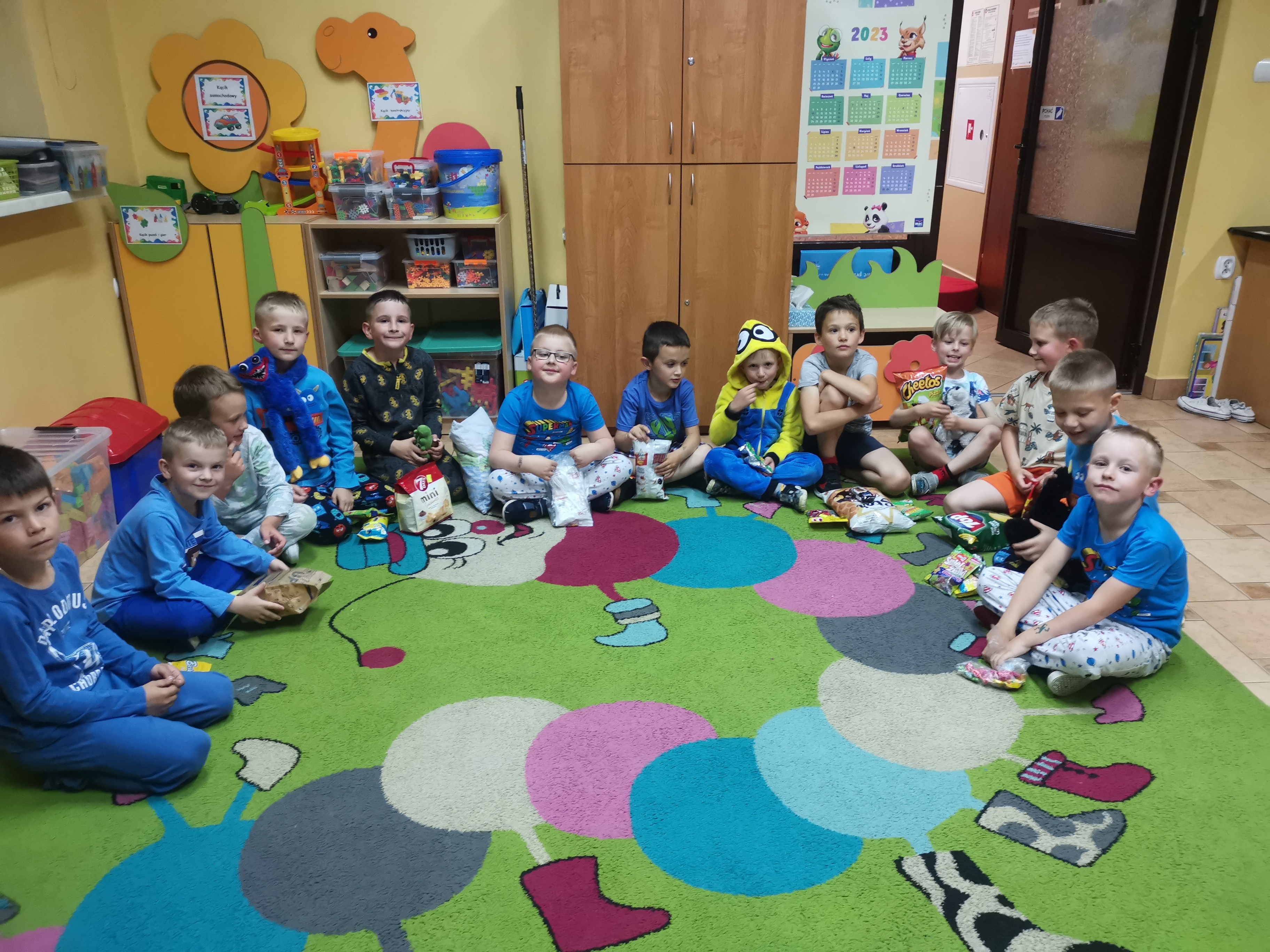 W ciągu 3-4 letniego pobytu dzieci w przedszkolu staramy się wyposażyć w wiedzę i umiejętności, które będą im potrzebne w życiu codziennym i przygotują do podjęcia nauki w szkole. Chcielibyśmy również, by opuszczając przedszkole zabrały ze sobą ogromny bagaż miłych wspomnień. Dlatego też zrodziła się myśl zorganizowania niecodziennego wydarzenia "NOC W PRZEDSZKOLU". Z piątku na sobotę - 16/17 czerwca - dzieci ze starszych grup 0A i 0B miały taką okazję. Od samego rana w salach starszaków tematem przewodnim było „nocowanie”. Emocje były ogromne, dzieci cały dzień dyskutowały, co będzie się działo i tylko odliczały czas….. a wszystko rozpoczęło się w piątek o 20.00 – wtedy to każdy uczestnik przybył obładowany solidnym bagażem, w którym musiał się znaleźć: poduszka i koc, przytulanką, smakołyki na wieczór filmowy, ulubiona zabawka oraz obowiązkowo piżama oraz pasta i szczoteczka do zębów.