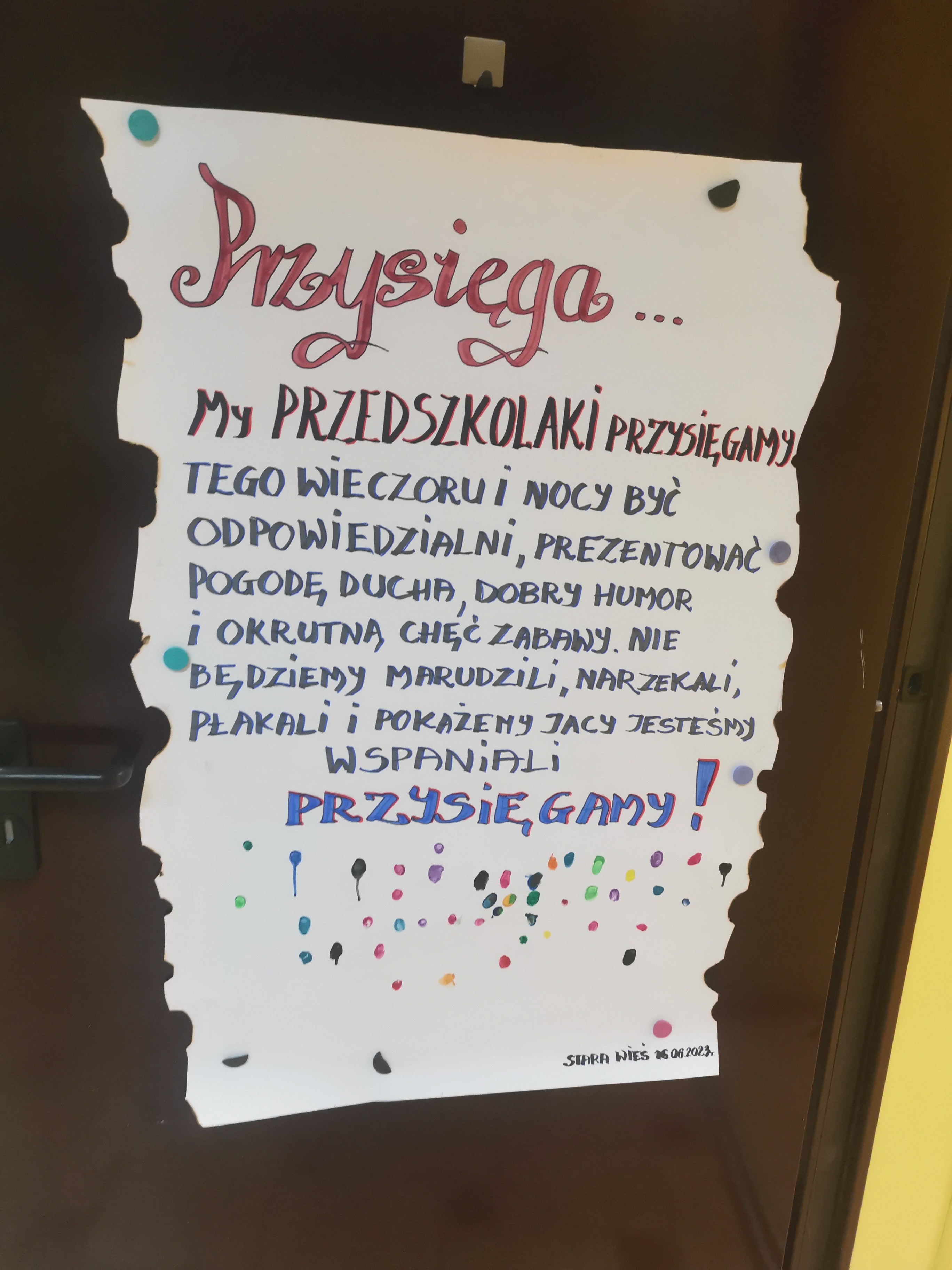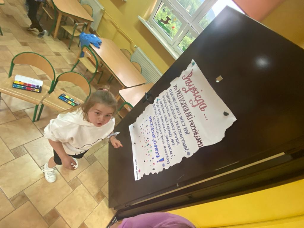 W drzwiach witała przedszkolaków Pani Dyrektor radosnym uśmiechem, by następnie zostać świadkiem składania przysięgi uczestniczących w nocowaniu. Każdy zobowiązał się do bycia odpowiedzialnym, prezentować dobry humor oraz niepohamowaną chęć zabawy. Ponadto obiecali nie marudzić i narzekać, a na znak akceptacji każdy przypieczętował słowa przysięgi własnoręcznym odbiciem palca. Po części oficjalnej Pani Dyrektor zrobiła sobie z dzieciakami pamiątkowe zdjęcie, życząc udanej i bezpiecznej zabawy.