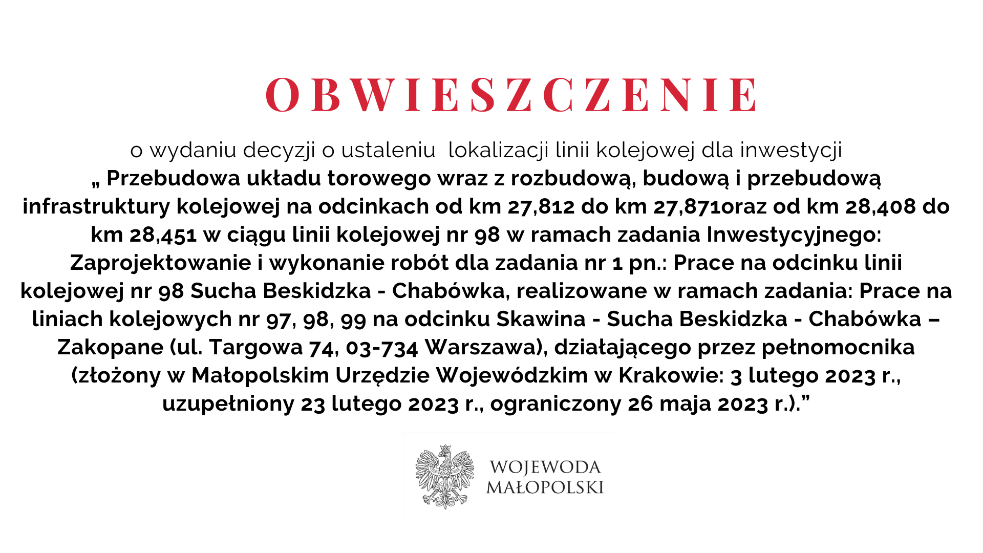 zawiadamia, 6 czerwca 2023 r. została wydana decyzja o ustaleniu lokalizacji linii kolejowej dla inwestycji pn.: Przebudowa układu torowego wraz z rozbudową, budową i przebudową infrastruktury kolejowej na odcinkach od km 27,812 do km 27,871oraz od km 28,408 do km 28,451 w ciągu linii kolejowej nr 98 w ramach zadania Inwestycyjnego: Zaprojektowanie i wykonanie robót dla zadania nr 1 pn.: Prace na odcinku linii kolejowej nr 98 Sucha Beskidzka - Chabówka, realizowane w ramach zadania: Prace na liniach kolejowych nr 97, 98, 99 na odcinku Skawina - Sucha Beskidzka - Chabówka – Zakopane (ul. Targowa 74, 03-734 Warszawa), działającego przez pełnomocnika (złożony w Małopolskim Urzędzie Wojewódzkim w Krakowie: 3 lutego 2023 r., uzupełniony 23 lutego 2023 r., ograniczony 26 maja 2023 r.).Zgodnie z art. 9w ust.1 utk, przedmiotowej decyzji został nadany rygor natychmiastowej wykonalności.