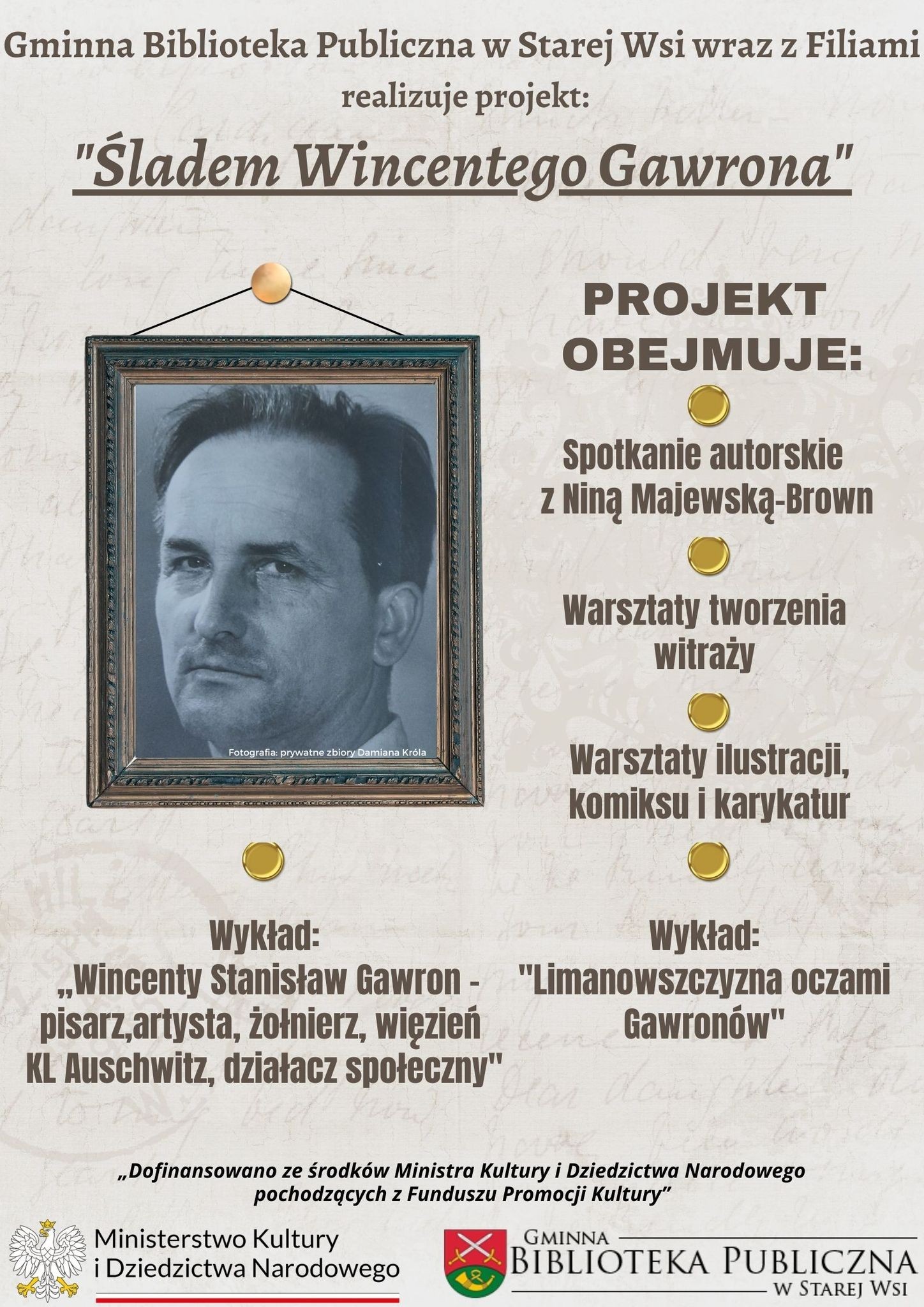 Z tej okazji powstał projekt: ,,Śladem Wincentego Gawrona”, który przybliży mieszkańcom tę postać, utrwali tożsamość kulturową i przyczyni się do promocji czytelnictwa poprzez spopularyzowanie literatury obozowej. Uczestnicy idąc tropem Wincentego na wzór artysty wykonają witraże, karykatury i zapoznają się z przeżyciami obozowymi opisanymi w książce przez bohatera i na spotkaniu z jedną z najpopularniejszych autorek literatury obozowej.