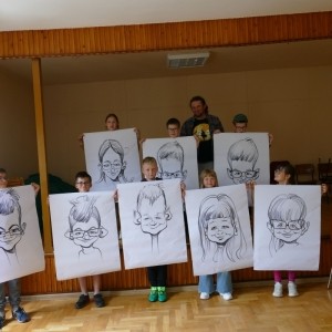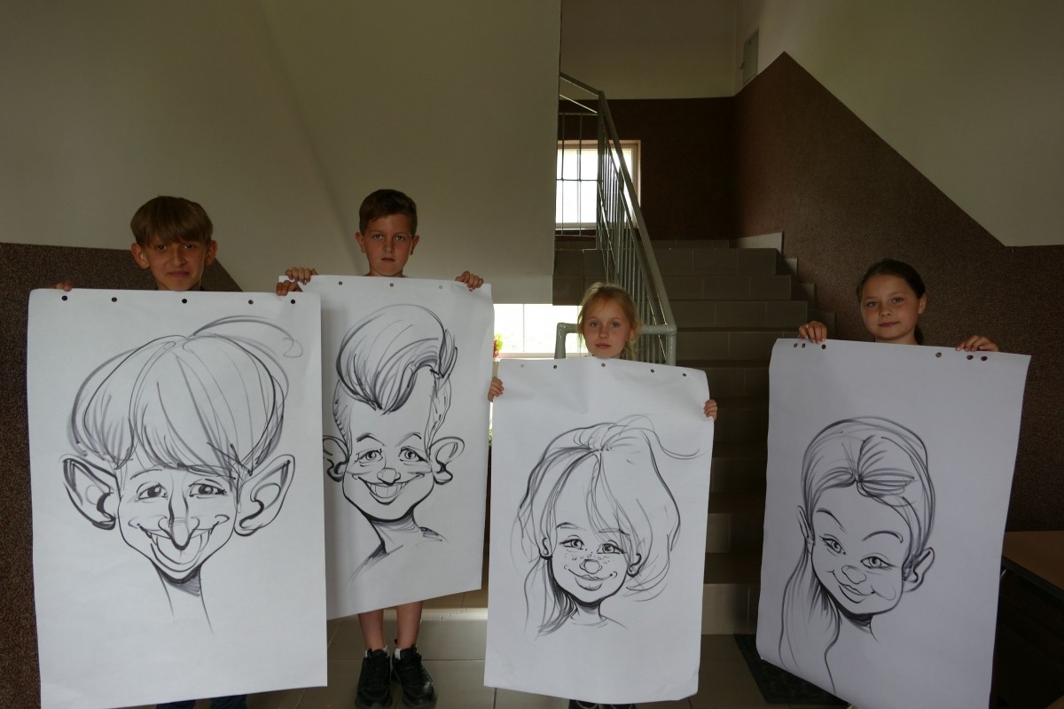 Uczestnicy na początku usłyszeli garść ciekawych informacji o genezie karykatury, czym charakteryzuje się ten rodzaj portretu, a także o samej pracy rysownika. Następnie ilustrator pokazał uczestnikom krok po kroku, jak narysować karykaturę, na co zwrócić uwagę i które elementy twarzy uwypuklić. Uczniowie podczas zajęć mieli okazję sami narysować karykatury swoich koleżanek i kolegów. Instruktor narysował też kilka karykatur wybranych warsztatowiczów, którzy po zakończeniu mogli zabrać swoje żartobliwe podobizny do domu. Uśmiechy nie schodziły dzieciom z twarzy, a końcowe efekty ich pracy wzbudziły zachwyt i zadowolenie. Zajęcia dostarczyły sporej dawki dobrego humoru i świetnej zabawy.