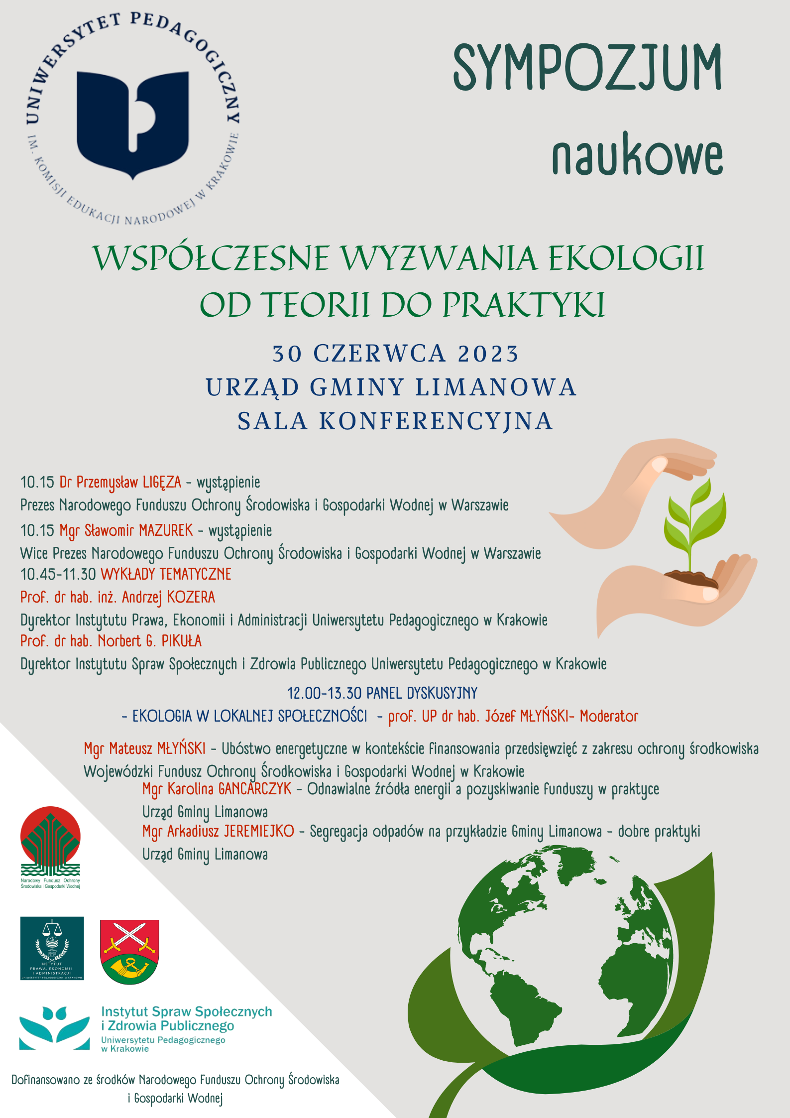 Sympozjum jest dwuetapowe, pierwsze wykłady odbędą się w Uniwersytecie Pedagogicznym w Krakowie w czwartek a druga część będzie miała miejsce w Urzędzie Gminy Limanowa.  Sympozjum jest pod nazwą " WSPÓŁCZESNE WYZWANIA EKOLOGII OD TEORII DO PRAKTYKI" i bedzie składało sie z siedmiu paneli dyskusyjnych, które poprowadzą wykładowcy z Uniwersytetu Pedagogicznego w Krakowie, jak i specialisci w dziedzinie Ekologii. Szczegóły wykładów i listę prelegentów znajdą Państwo na plakacie.