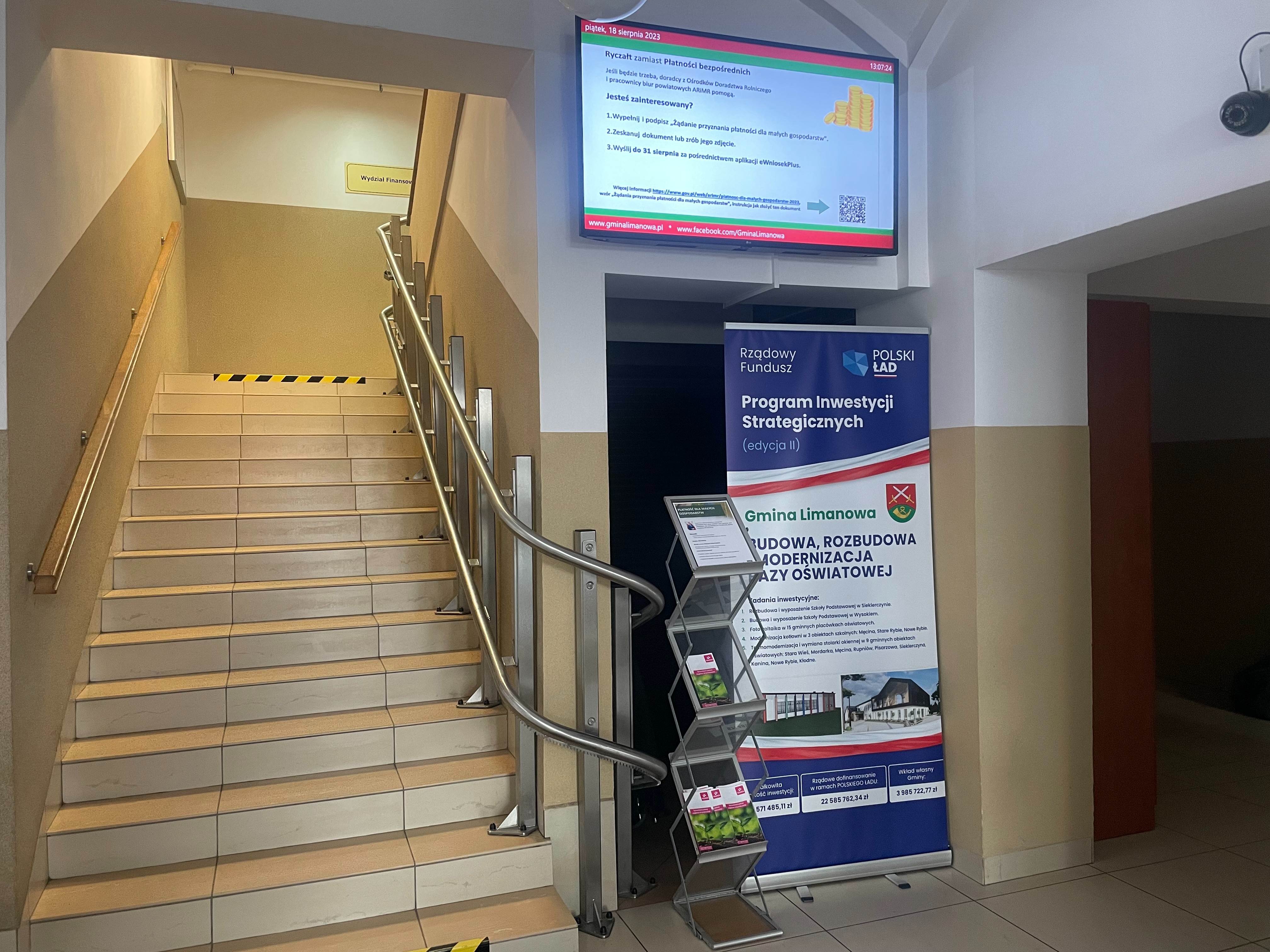 Zakupiono już sprzęty do ewakuacji tj. krzesło i materac ewakuacyjny, pętle indukcyjne, które zlokalizowano w najbardziej odwiedzanych przez petentów miejscach w Urzędzie. Wykonano już część oznakowania. W chwili obecnej opracowywany jest plan tyflograficzny i nagrywany jest film w języku migowym. W budynku Urzędu funkcjonuje też platforma schodowa z przeznaczeniem dla osób niepełnosprawnych, a w gotowości jest też wózek inwalidzki. Zapewniono też pakiet szkoleń dla pracowników, mających bezpośredni kontakt z petentami.Efekt, jaki zostanie osiągnięty po zakończeniu realizacji zadania, to udostępnienie mieszkańcom i gościom przystosowanego do potrzeb osób z niepełnosprawnościami budynku administracyjnego Urzędu Gminy Limanowa.