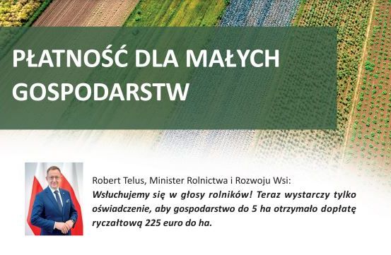 Obecnie trwa nabór wniosków w ramach płatności dla małych gospodarstw, która to płatność zastąpi wszystkie wnioskowane płatności bezpośrednie ujęte we wniosku o przyznanie płatności za rok 2023. Stawka ryczałtu wynosi 225 euro/ha. Rolnik może otrzymać płatności dla małych gospodarstw jeżeli we wniosku o przyznanie płatności na rok 2023 (złożonym w terminie od 15 marca do 25 lipca