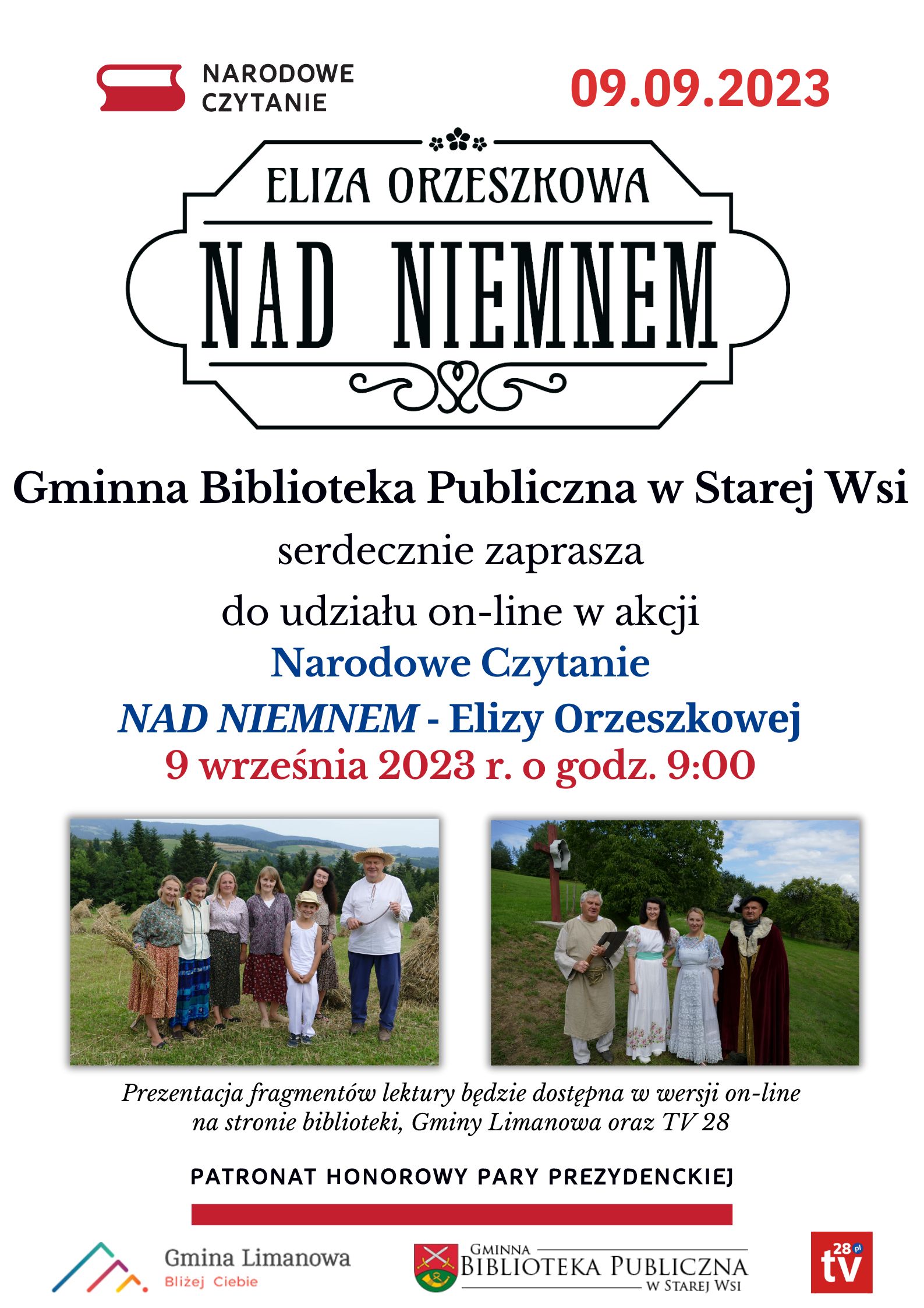 Narodowe Czytanie w tym roku w Gminnej Bibliotece Publicznej będzie miało formę on-line. Premiera będzie w sobotę, 9 września, o godzinie 9.00 na kanale lokalnej telewizji: TV28, stronie Gminnej Biblioteki Publicznej w Starej Wsi oraz Gminy Limanowa. Scenerią do czytanej lektury będą urokliwe zakątki gminy Limanowa, nawiązujące do miejsc, w których rozgrywa się akcja książki Elizy Orzeszkowej.
