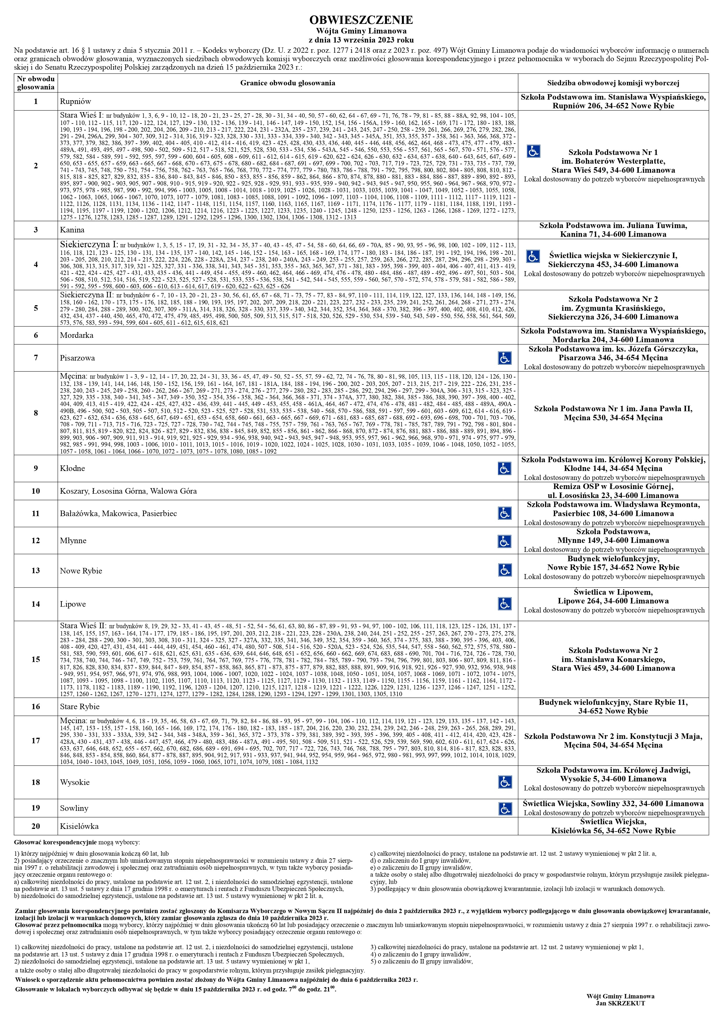 Obwieszczenie Wójta Gminy Limanowa z dnia 13.09.2023r.dotyczące obwodów do głosowania.