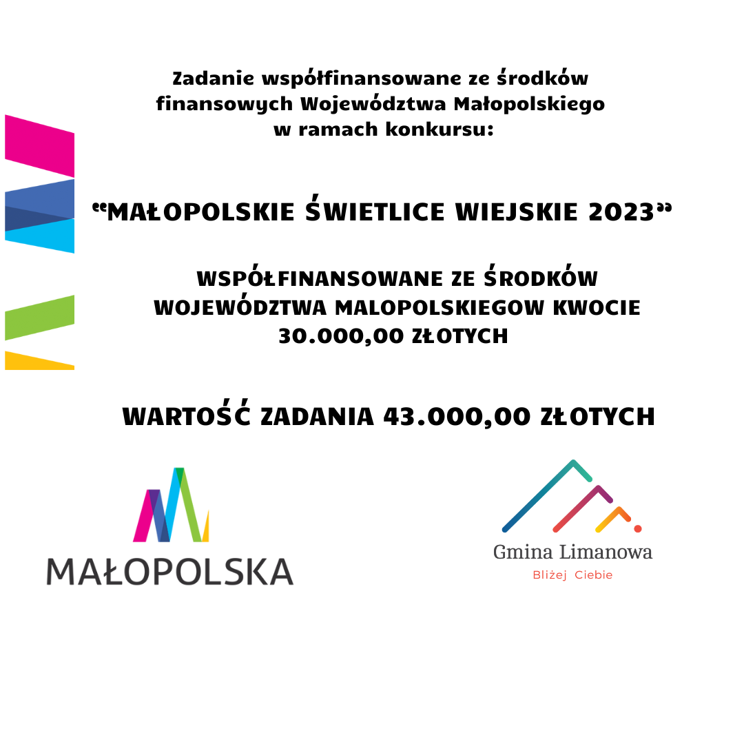 " ZADANIE WSPÓŁFINANSOWANE ZE ŚRODKÓW FINANSOWYCH WOJEWÓDZTWA MAŁOPOLSKIEGO W RAMACH KONKURSU PN " MAŁOPOLSKIE ŚWIETLICE WIEJSKIE 2023"
