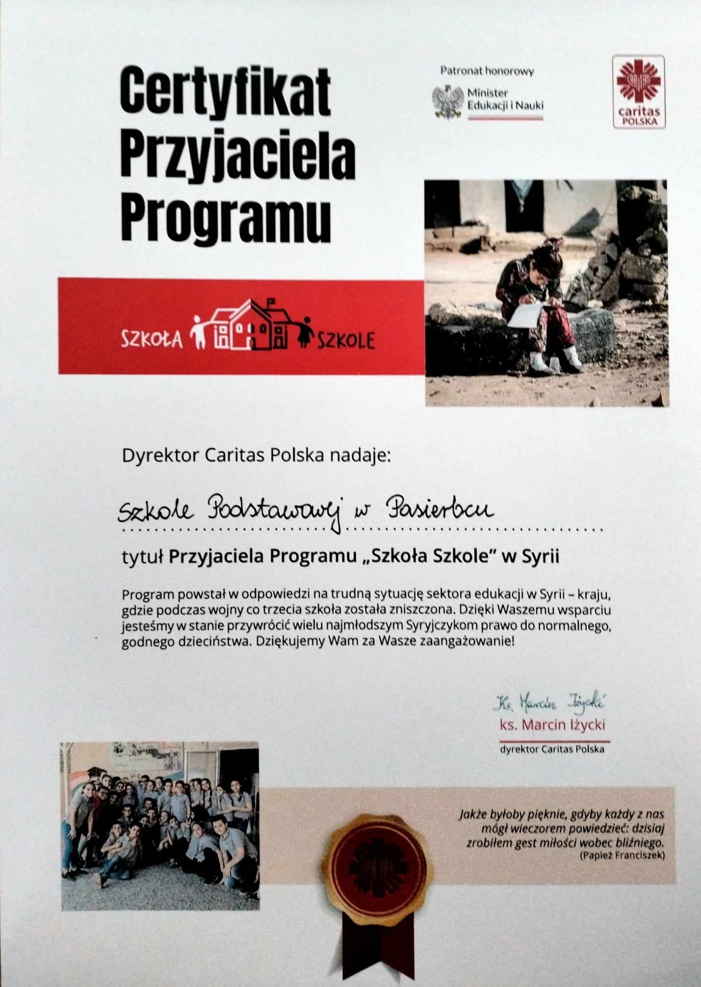 19 października 2023r. w Szkole Podstawowej w Pasierbcu obchodzony był Dzień Papieski. Z tej okazji wolontariusze Szkolnego Koła Caritas pod kierunkiem opiekunów, przygotowali montaż słowno-muzyczny na temat pontyfikatu Jana Pawła II. Wolontariusze SKC w przystępny i ciekawy sposób zaprezentowali działalność Papieża Polaka, uświetniając apel pięknymi pieśniami, także tymi bliskimi sercu Jana Pawła II. W trakcie spotkania miało miejsce uroczyste przyjęcie w poczet wolontariuszy Szkolnego Koła Caritas 16 nowych uczniów.