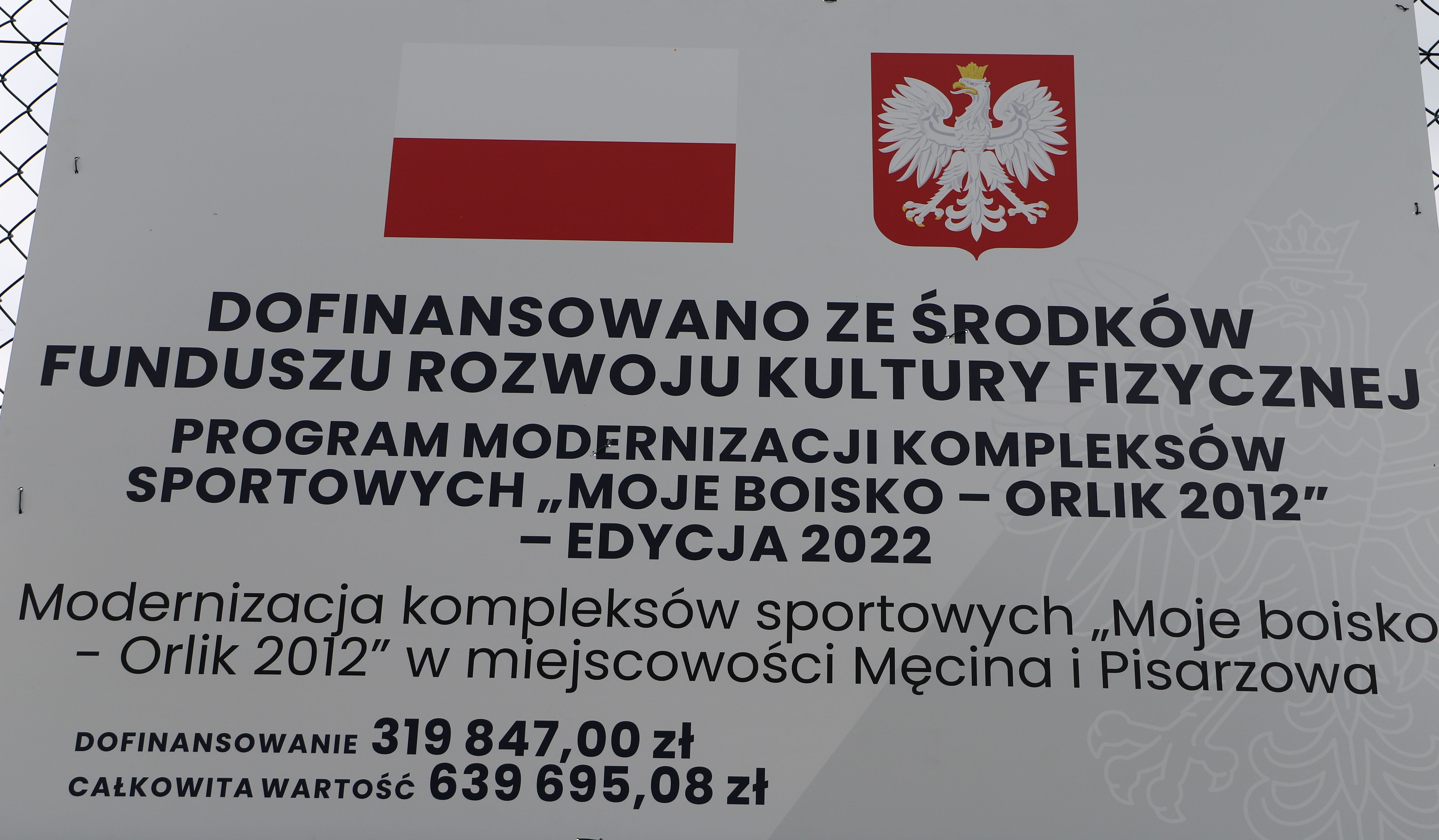 Zadanie zostało zrealizowane przy wsparciu środków Funduszu Rozwoju Kultury Fizycznej, których dysponentem jest Minister Sportu i Turystyki w ramach Programu modernizacji kompleksów sportowych „MOJE BOISKO – ORLIK 2012” – EDYCJA 2022.